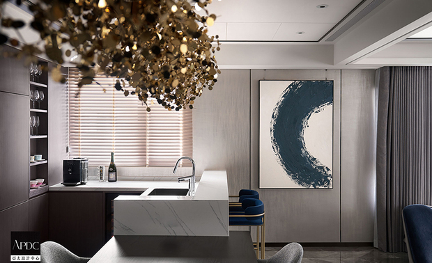 ▲餐厨区餐桌连结白色石纹吧台,提供轻食准备兼休閒的理想场所。一幅蓝灰渐层的抽象画作与另一侧的圆弧水墨画,为该区注入艺术气息,同时再次呼应上空四颗吊灯,强调「圆满」之意。