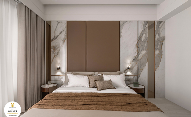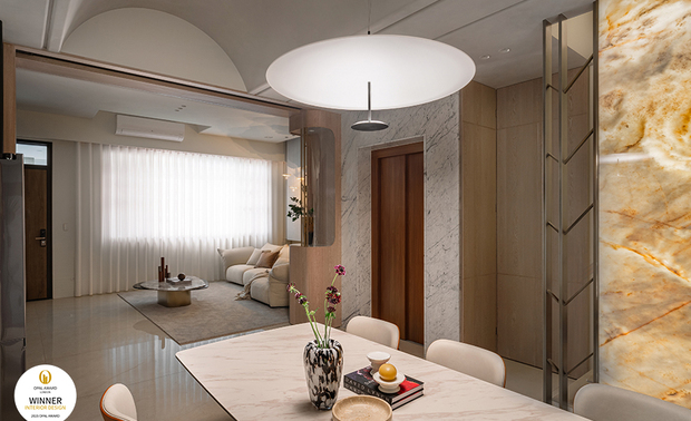 OUTSTANDING PROPERTY AWARD LONDON,OPAL(英国伦敦杰出地产大奖)由全球知名企业集团Farmani Group组织,并以招揽全球最佳建筑师、室内设计师与房地产开发商为目标,在创造异业菁英联合平台的同时,找寻各地最富创造力、革新感、社会影响力与永续性的设计方案。本届2025年赛事,安厝设计 主持设计师 王怡涵、设计师 方绎杉 融合华人文化、生活机能以及隐奢美学,于家宅作品《曙烨光宸》中,运用风水概念「背山面海」的吉祥意涵,沙发背牆以艺术涂料及吊灯光影勾勒绵延山势意象,提供业主心灵层面的依靠感;对侧电视牆则拼接海洋般色彩的蓝、绿、白玉石,创造开阔放鬆观感。处处蕴藏祝福寓意的优美生活端景,其富饶深厚新意的设计巧思备受评审团好评,一举抱回此次「Winner」大奖!