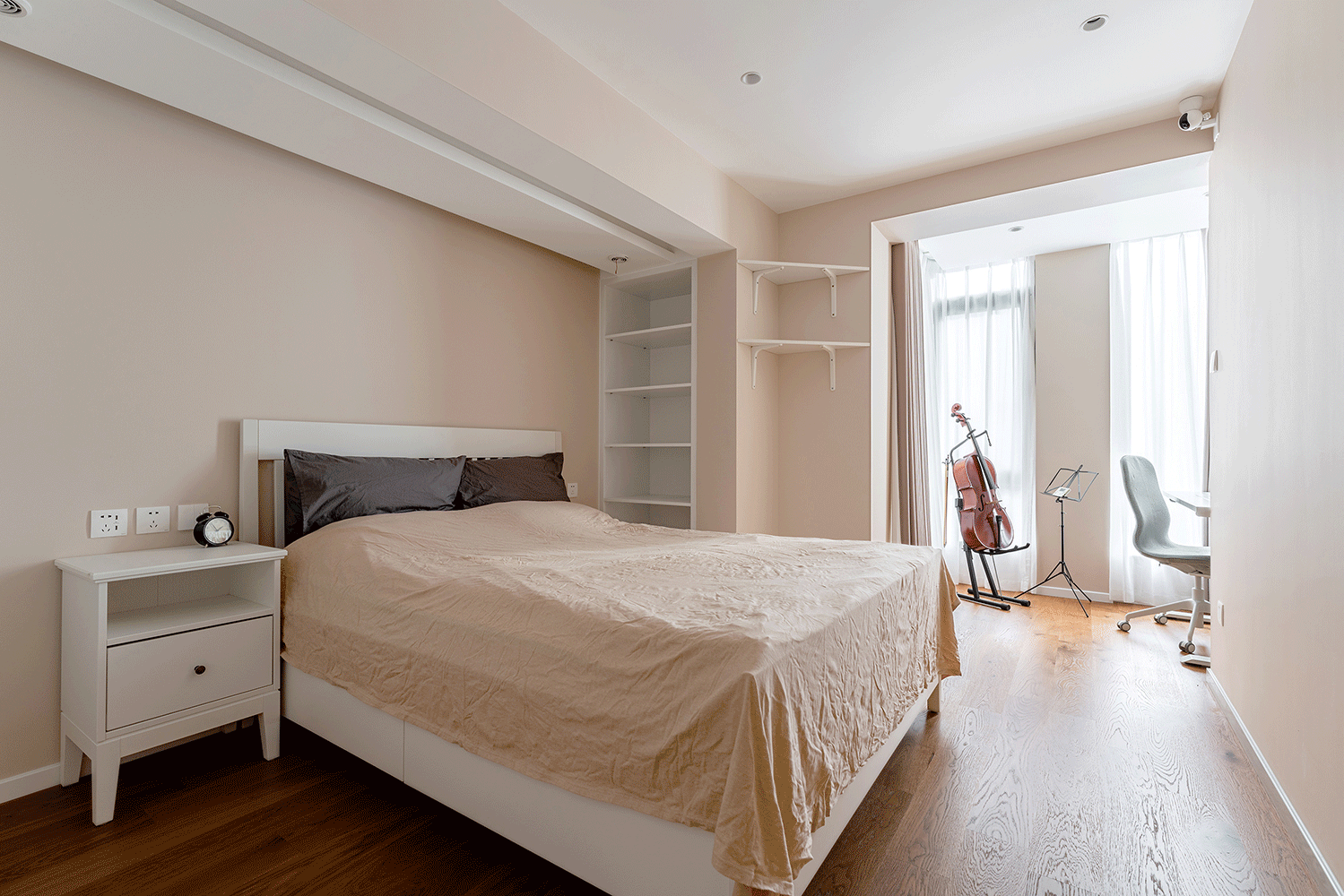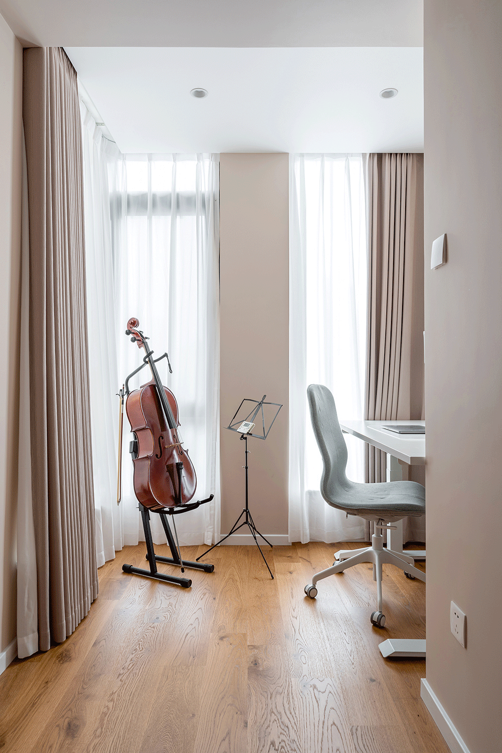 阳台改造的儿童学习区,靠窗大提琴练习角与白色书桌,形成动静分区,原木地板与米色墙面融成静谧底色。在琴声与书页翻动声下,为生活注入舒缓的治愈力。