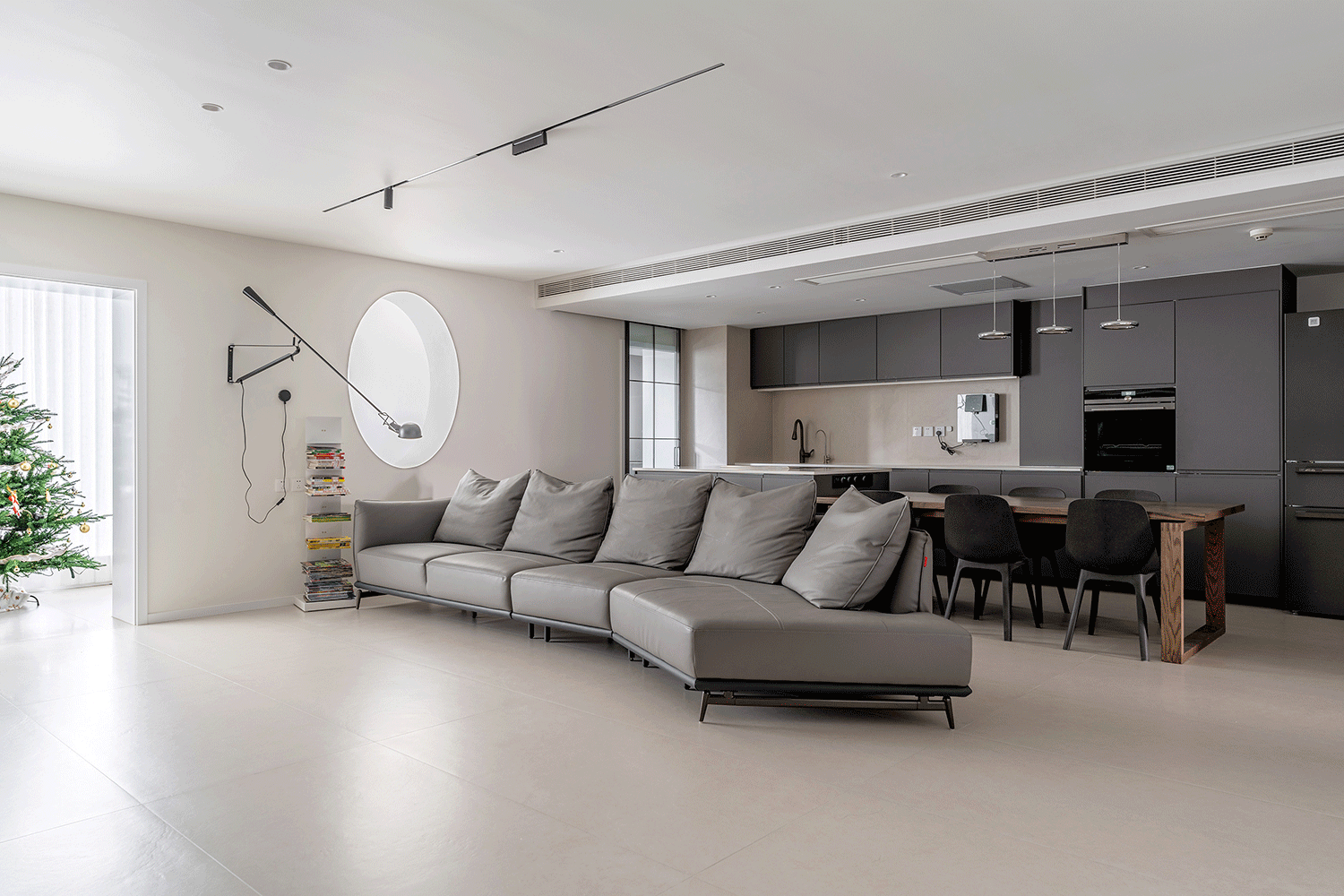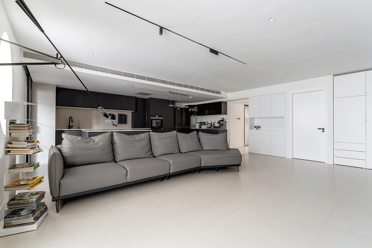 客厅采用大横厅设计,开放式布局打破空间壁垒,浅灰L型沙发不靠墙,通透视野自由舒展。与后方深灰色橱柜厨房形成无界联动,延伸出豁达的纵深感。
