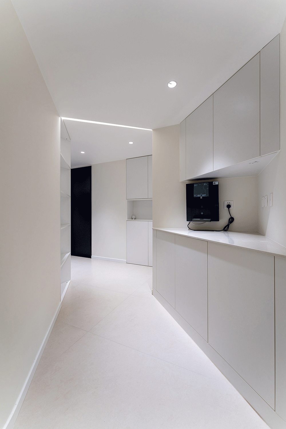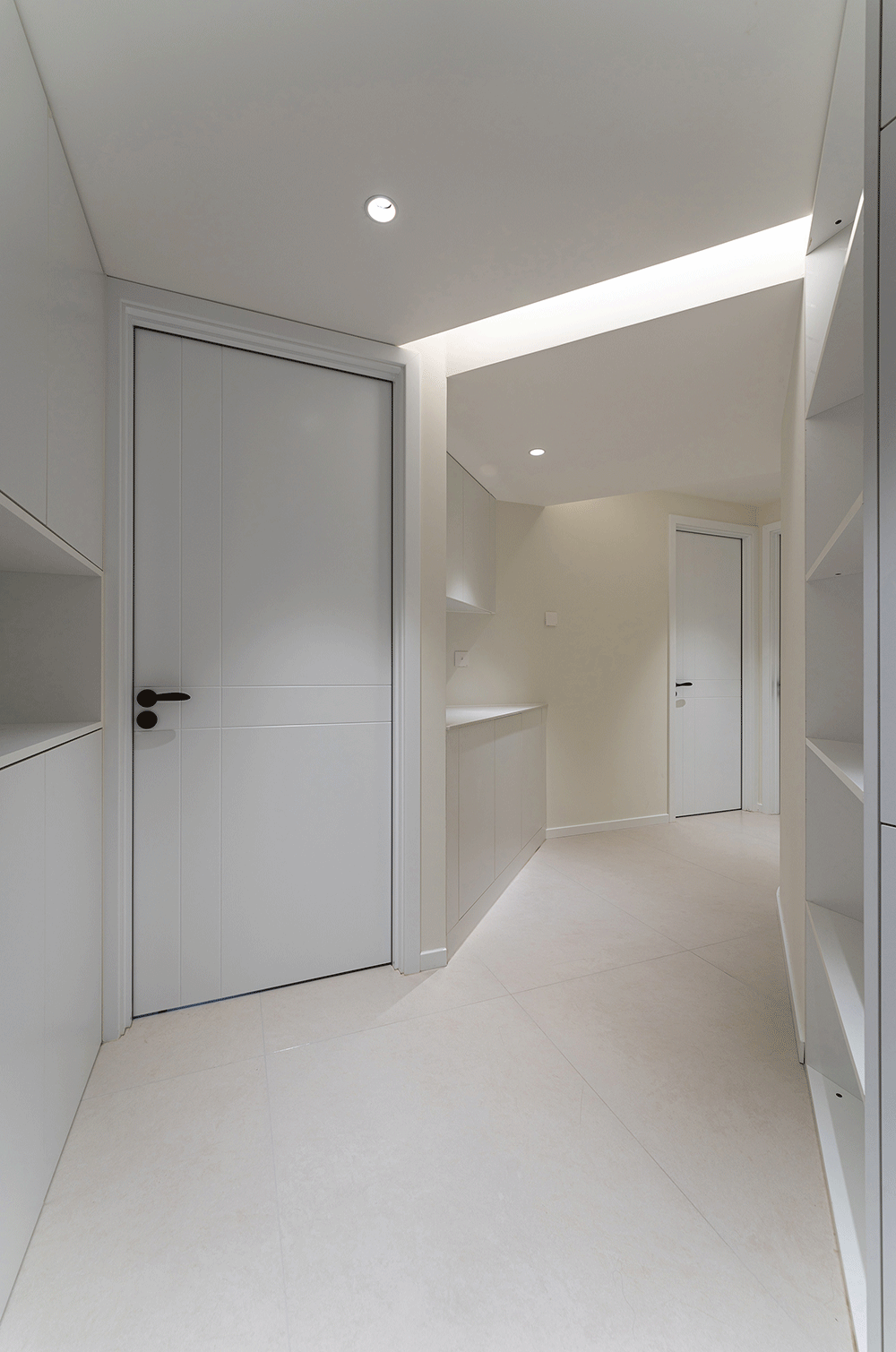 走廊的转角设计,可以有效缩短走廊长度,避免错综复杂的动线效果。嵌入灯带做分割,见光不见灯彰显极简风的高级感。整个空间采用纯白基调,柜体与墙体之间衔接的恰到好处,让转折处如呼吸般自然。