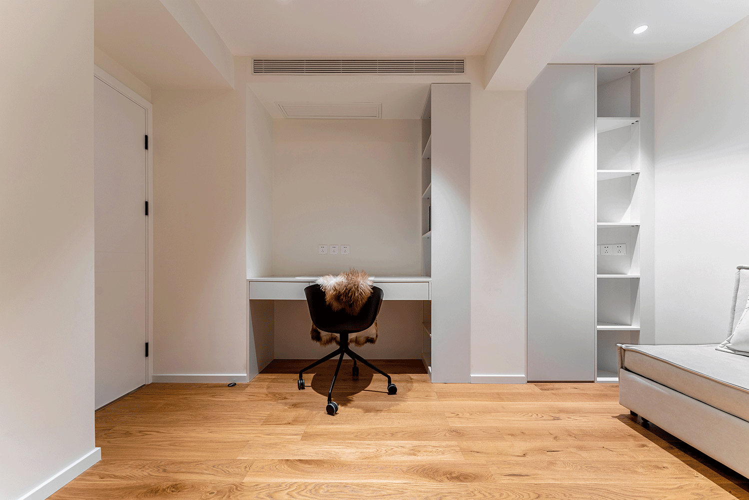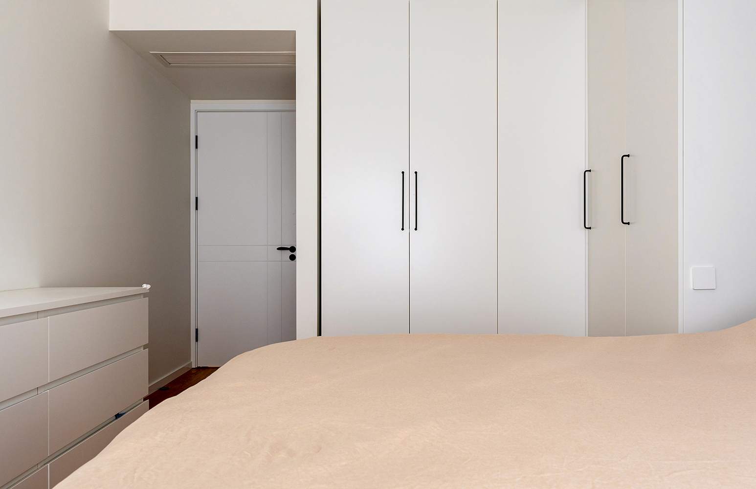 卧室打造嵌入式转角衣柜,既满足了日常的储物需求,同时保留充足的活动空间。一门到顶的设计,减少灰尘附着不会藏污纳垢。