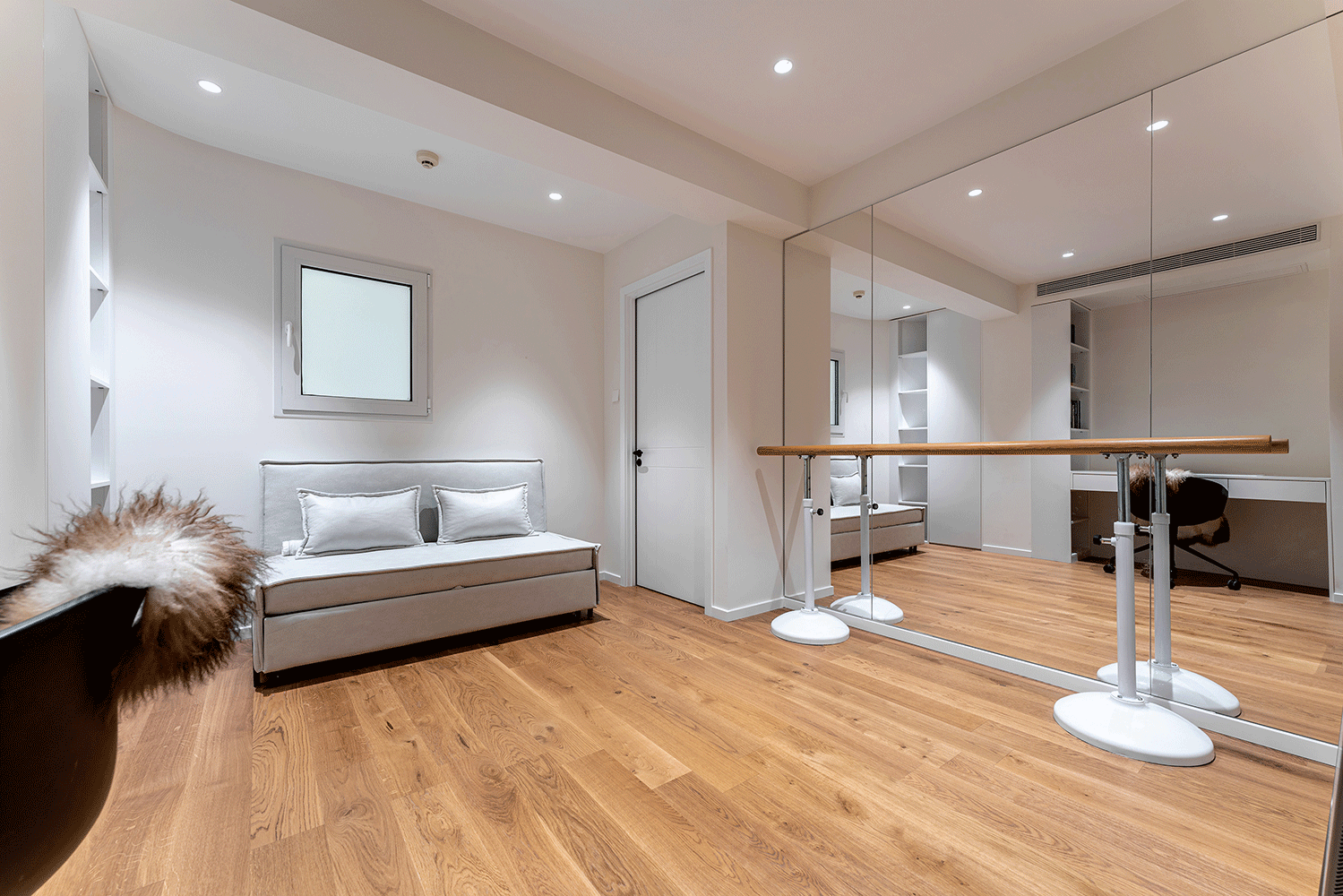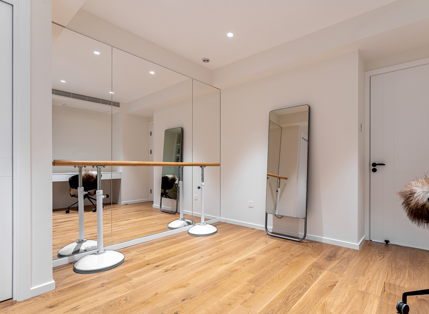 地面用木地板通铺,跳舞时脚感的舒适度更高。墙面增加一扇小的室内窗,增强部分采光和通风效果。顶部无主灯带来均匀的照明,不留光影死角,提升练习效果。