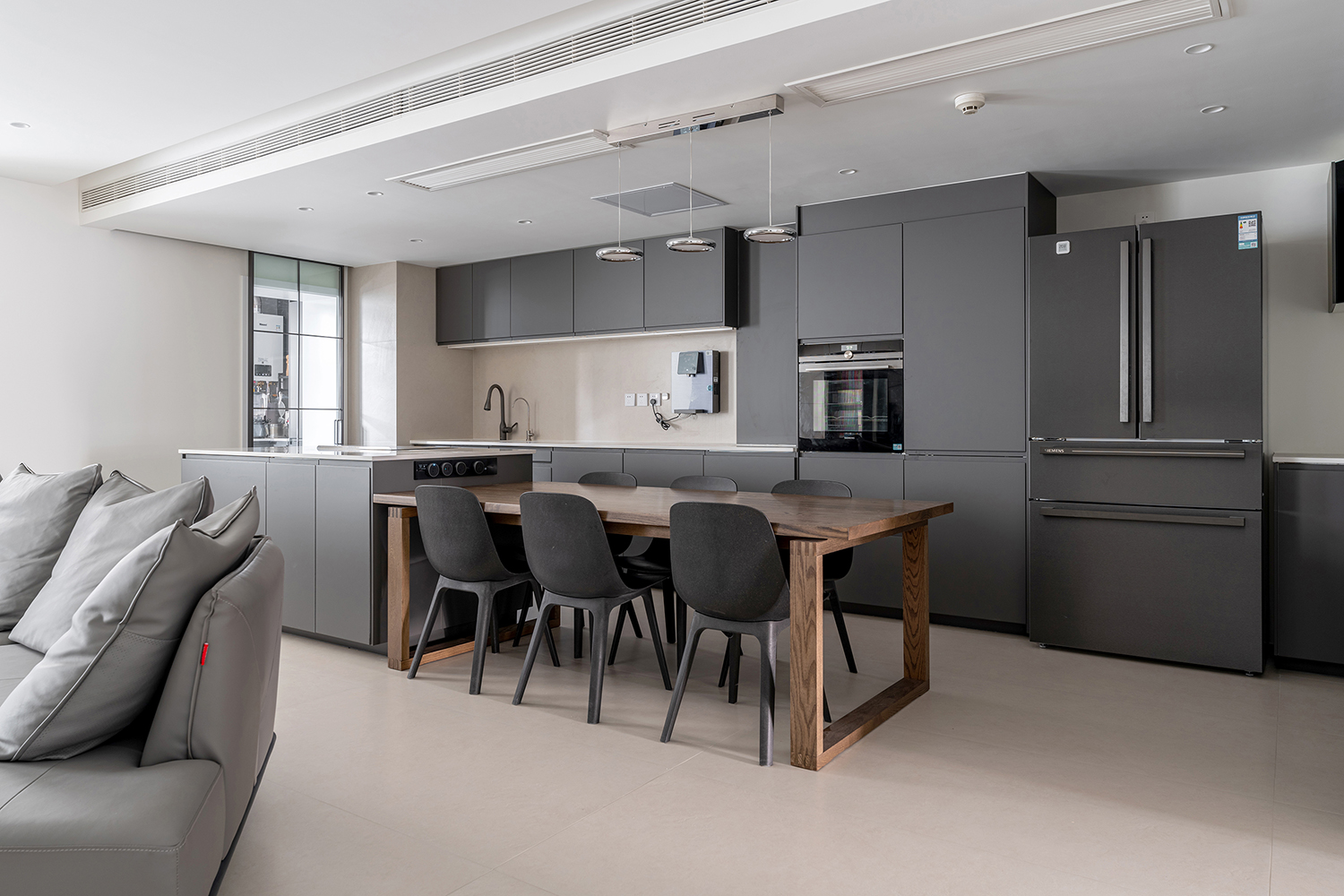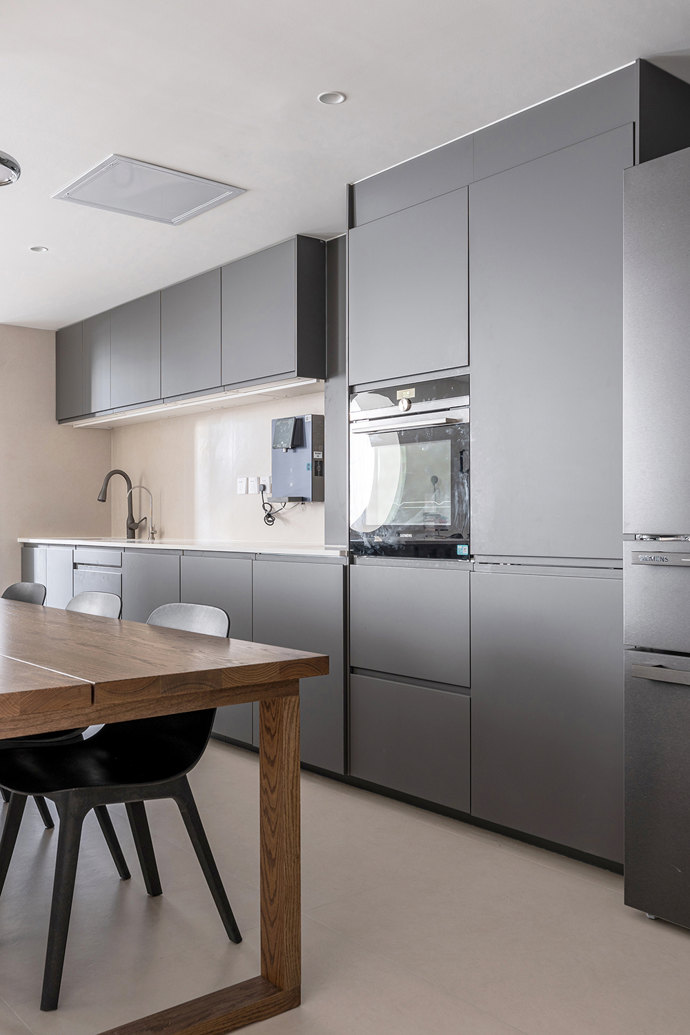 西厨的高柜与操作台连接,嵌入式烤箱、冰箱在纵向的收纳柜中消除体积感。横向延展的操作台,承接水槽功能,强化了烹饪动线的连贯性。