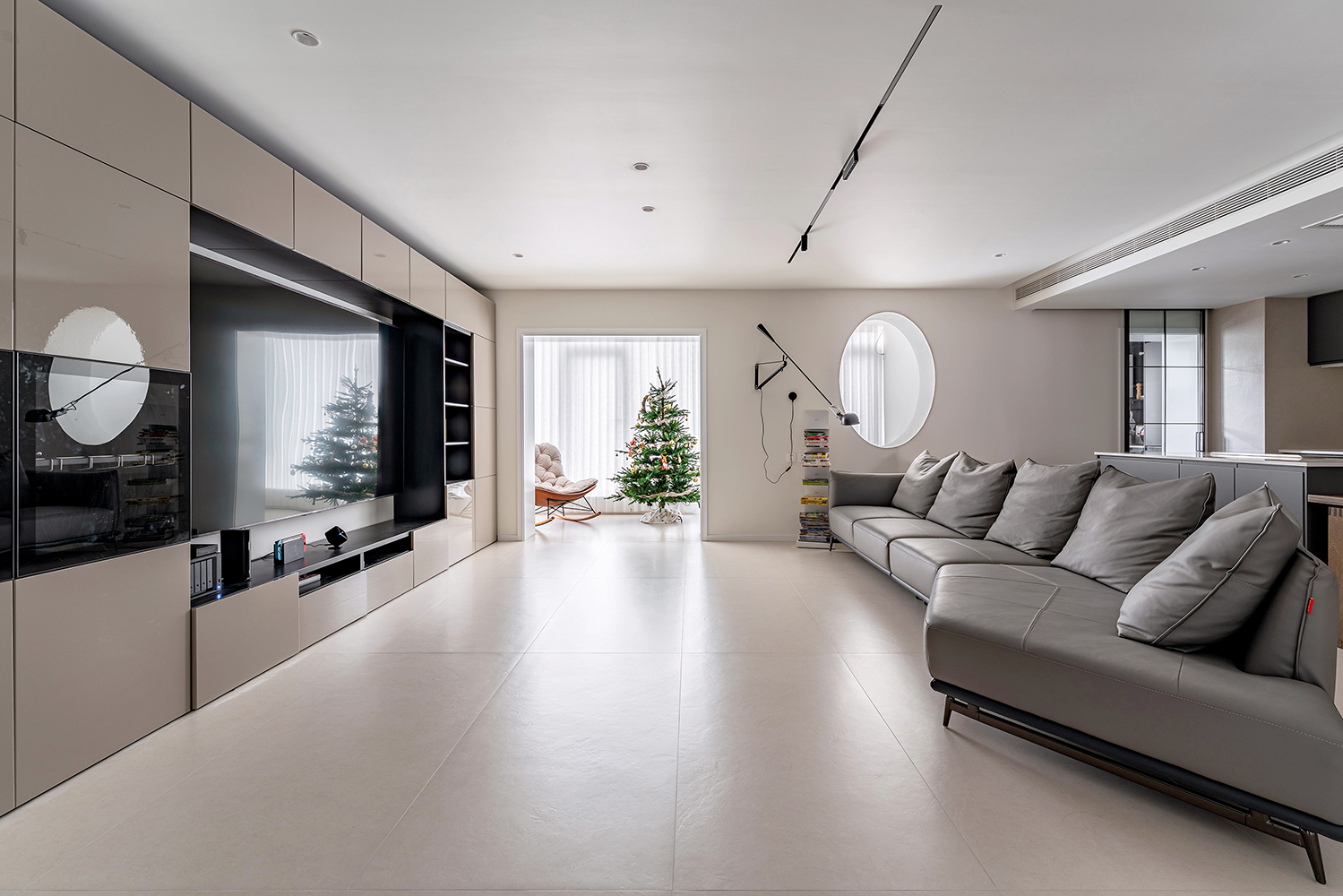 客厅无主灯设计不压低房高,凸显现代极简气质。暖灰色石材地面以温润肌理承接光线,与浅灰弧形沙发共同延展出通透的空间流动感。