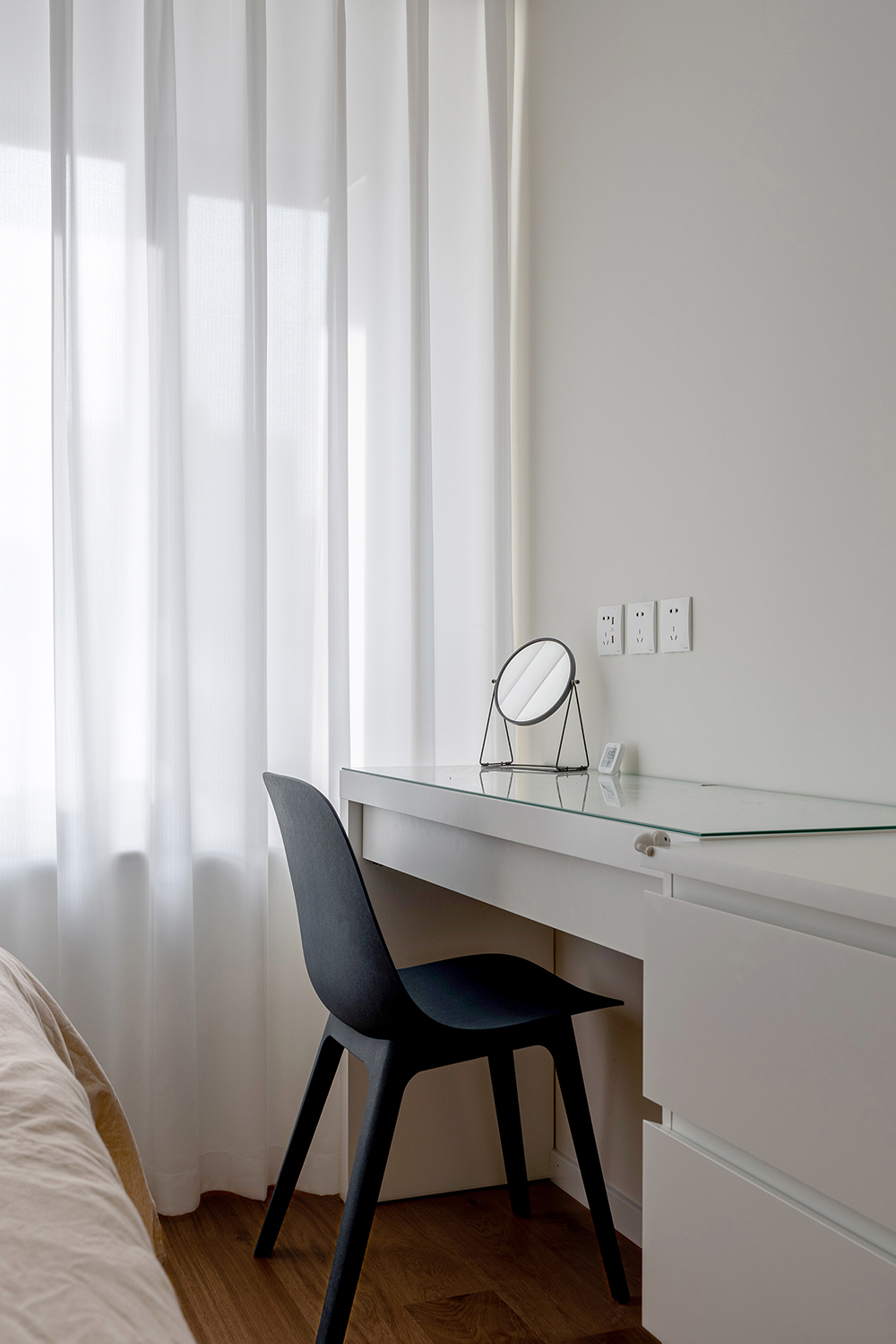 床脚处还摆放了一组梳妆台,白色极简台面搭配黑色靠背椅,形成视觉对比。台面圆镜与纱帘透过的柔光,交织出素雅氛围。