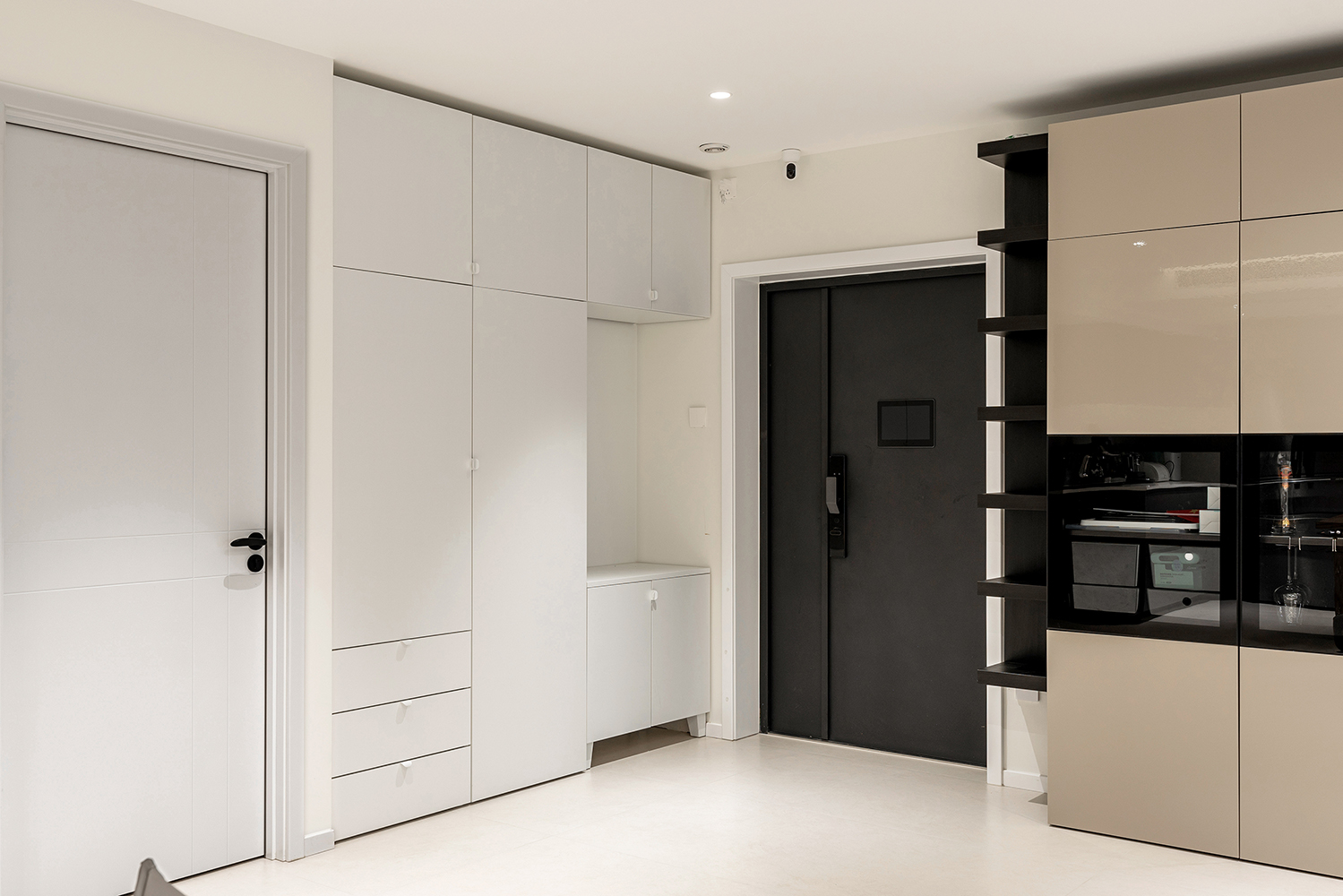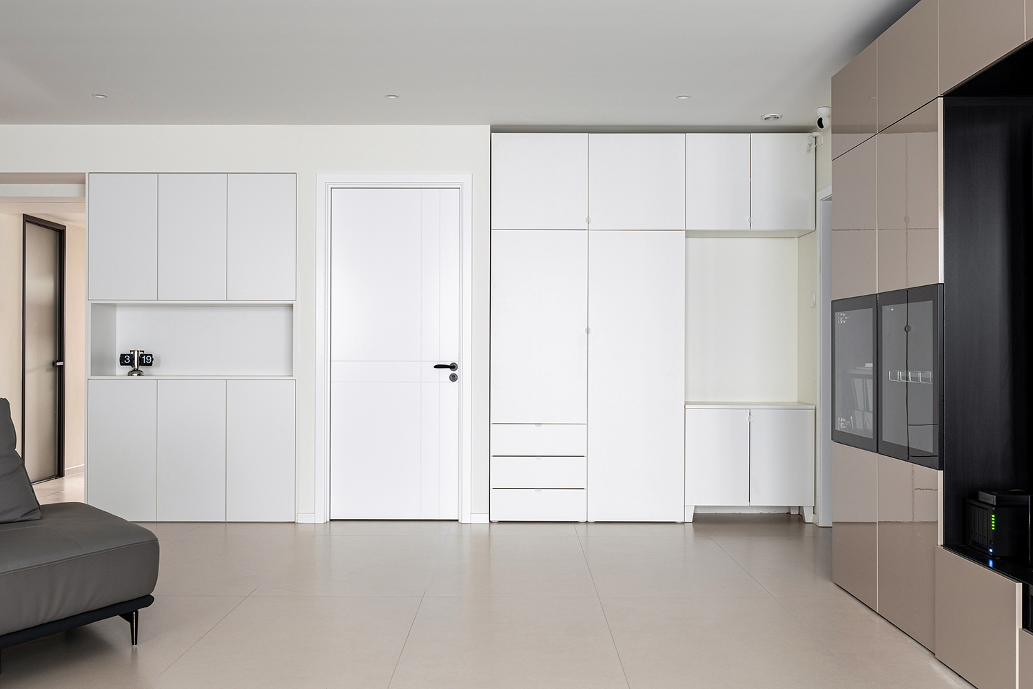 玄关门厅打造嵌入柜体,满足了储物功能,又避免显得局促和拥堵。浅灰地砖与纯白柜面形成呼应,提升明亮与轻盈感。