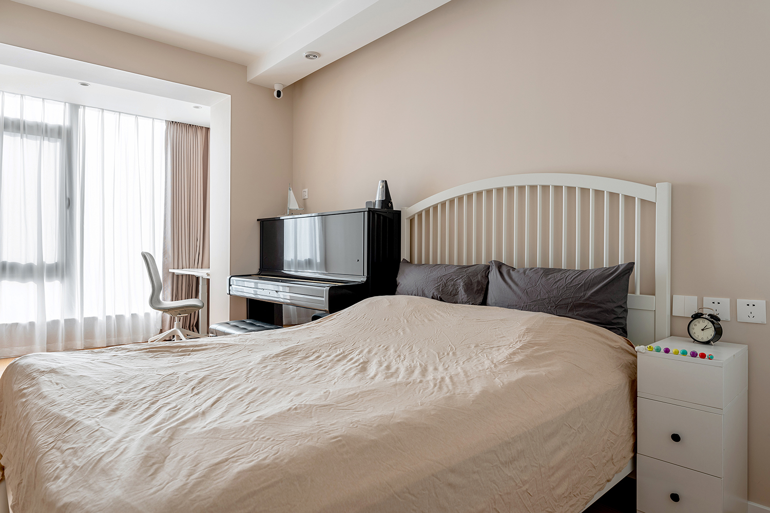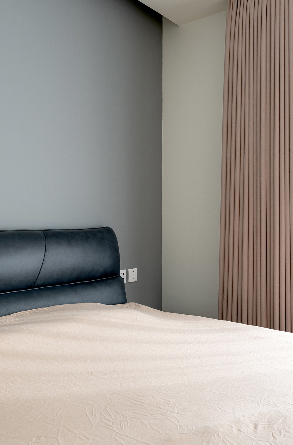 主卧以雾霾蓝床头为视觉焦点,搭配大面积的白色墙与柜,营造出清爽明亮的基底。肉桂色床品与同色窗帘软装相呼应,为空间注入温暖质感。