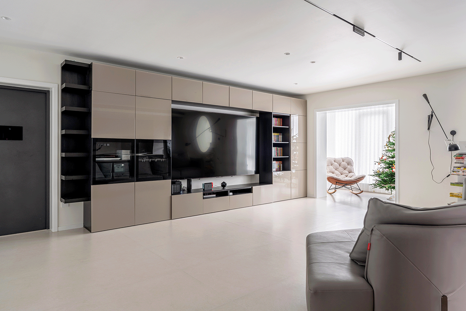 横跨5m的电视墙,以浅棕哑光柜门与黑色立柜构建出利落层次。