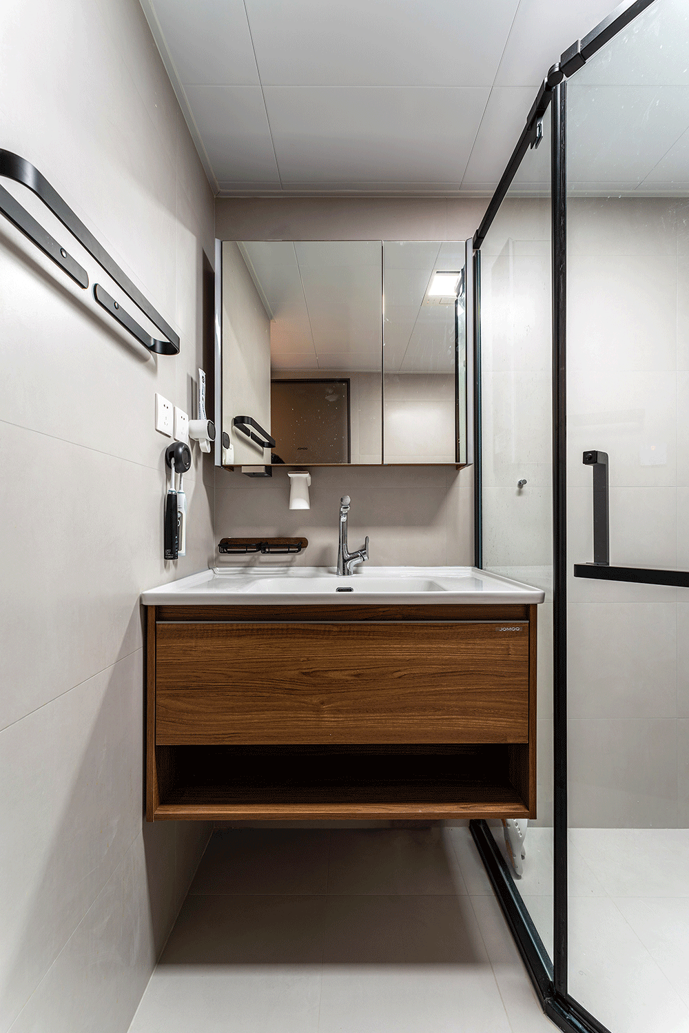 主卫悬挂式洗手台,搭配木纹柜体,上方镜柜既提供了收纳,又延伸视觉宽度。