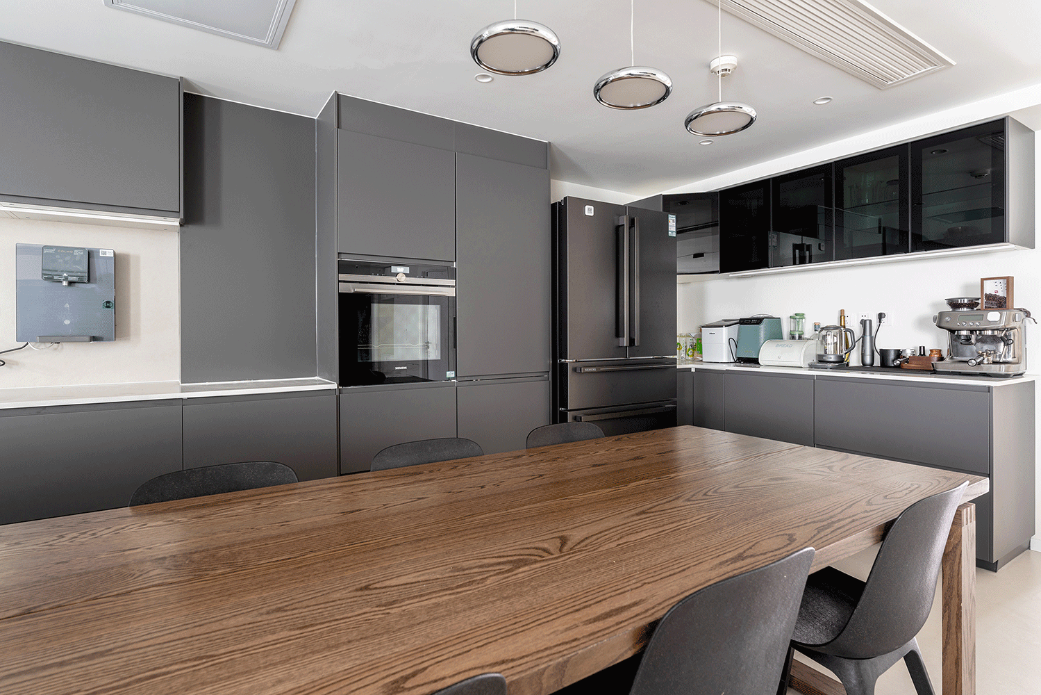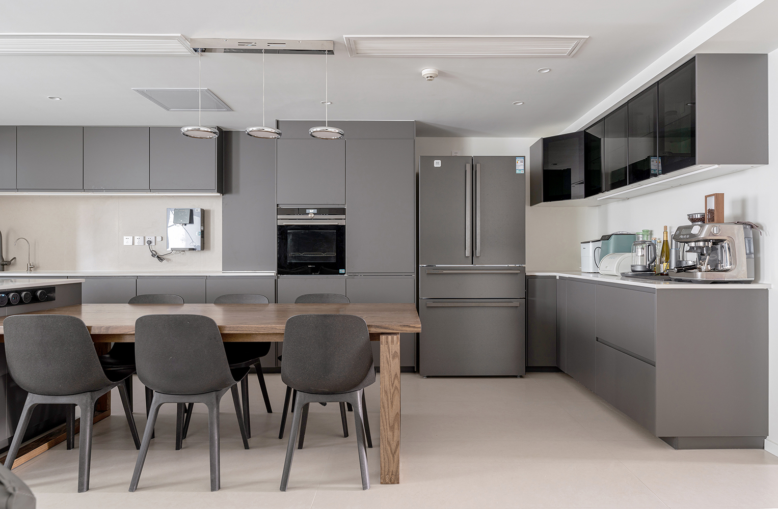 餐厅利用餐边柜做延伸划分出西厨空间,转角处灰色电器高柜将烤箱、冰箱完整内嵌,使用方便又显整洁。