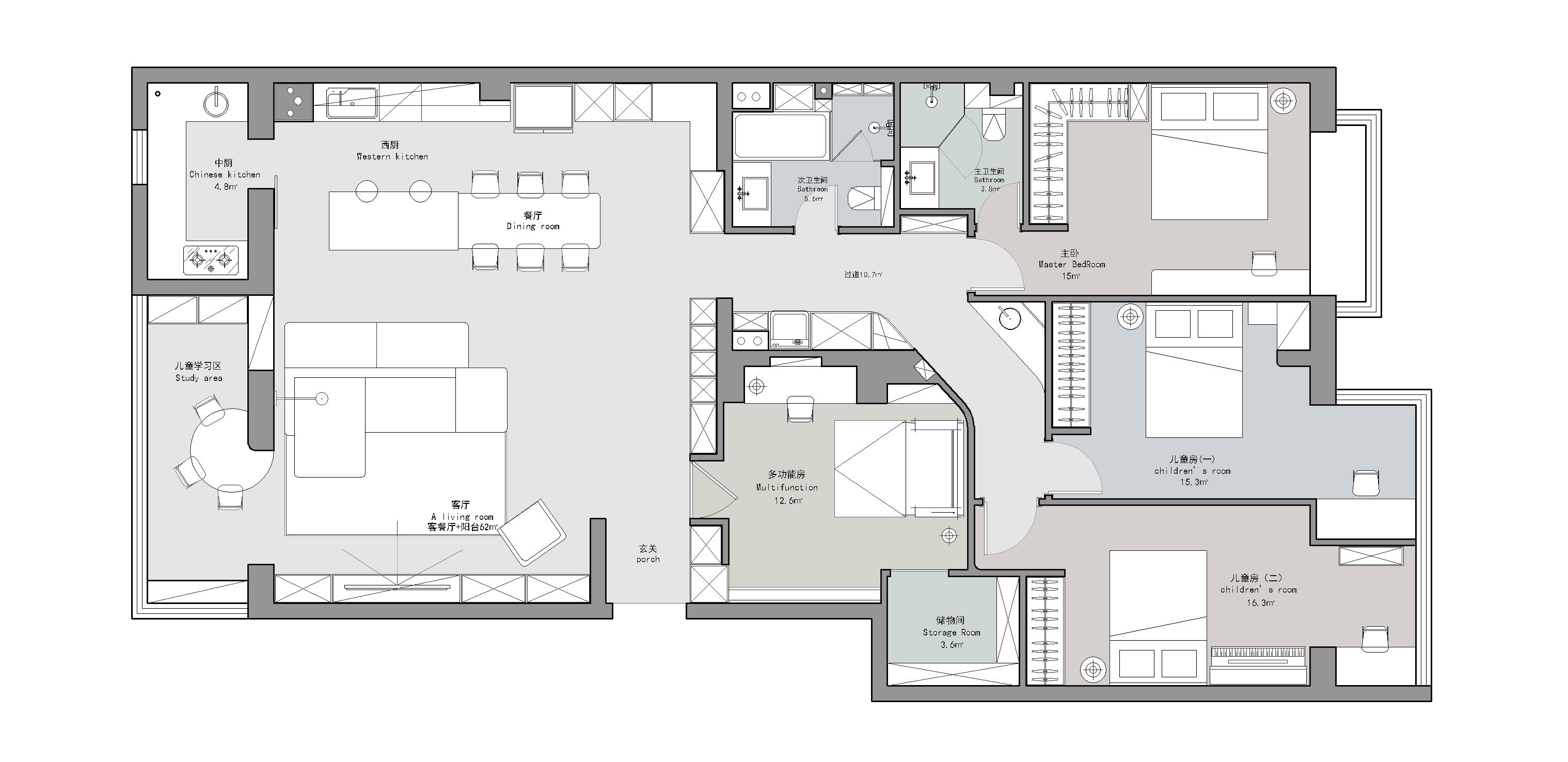 5.因为女主人从事舞蹈行业,两个孩子中的姐姐也受家里熏陶,需要再加一个多功能房,满足日常舞蹈练习。