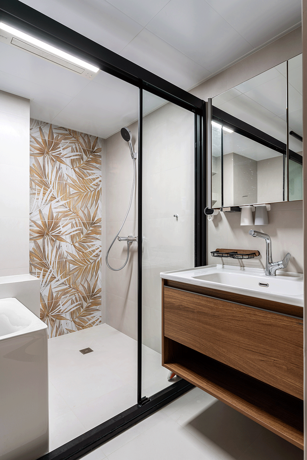 客卫生间里的淋浴房,还增加了浴缸的功能,平时练习完舞蹈泡个澡简直不要太舒服。淋浴房与洗漱区之间用玻璃隔断做划分,可以很好的隔绝水渍飞溅。