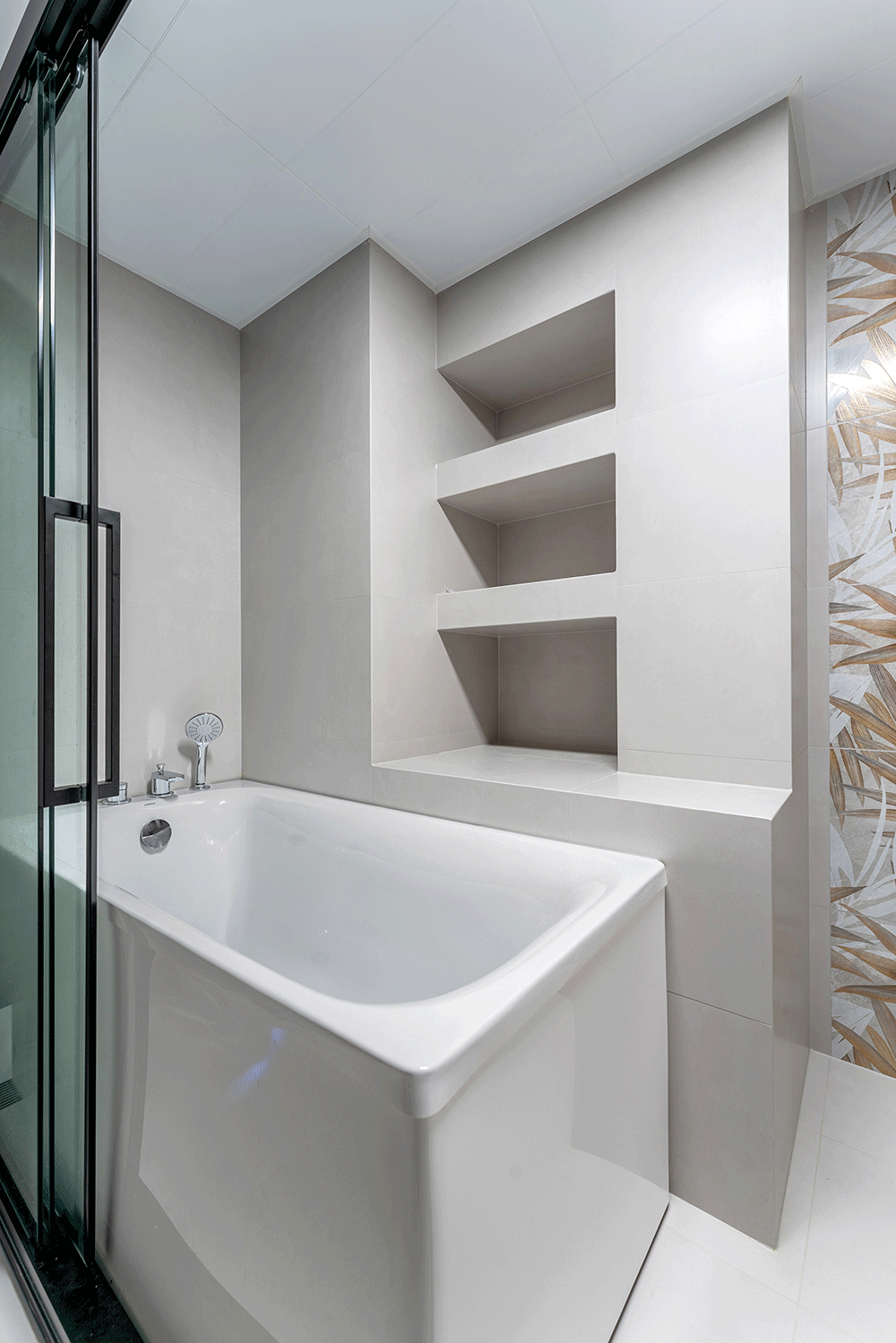 浴室巧妙利用管道墙体结构延伸出三组壁龛,白色瓷砖包裹的壁龛与管道墙融为一体。既隐藏了管道又拓展了收纳功能,沐浴用品可分层摆放更显整洁。