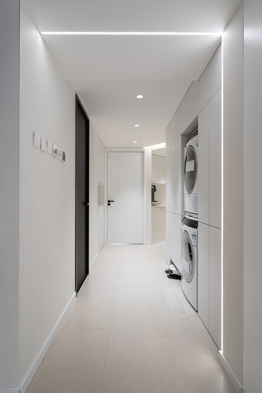 走廊除了连接各个卧室入口,还融入了杂物柜和嵌入洗烘套装的家政功能。从墙到顶的线性灯分割空间,既增强了空间层次,也让弱化了走廊的冗长感。
