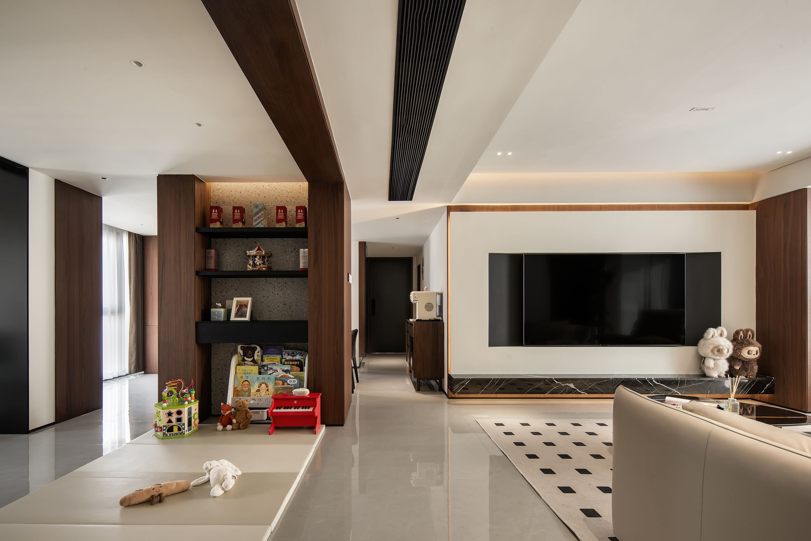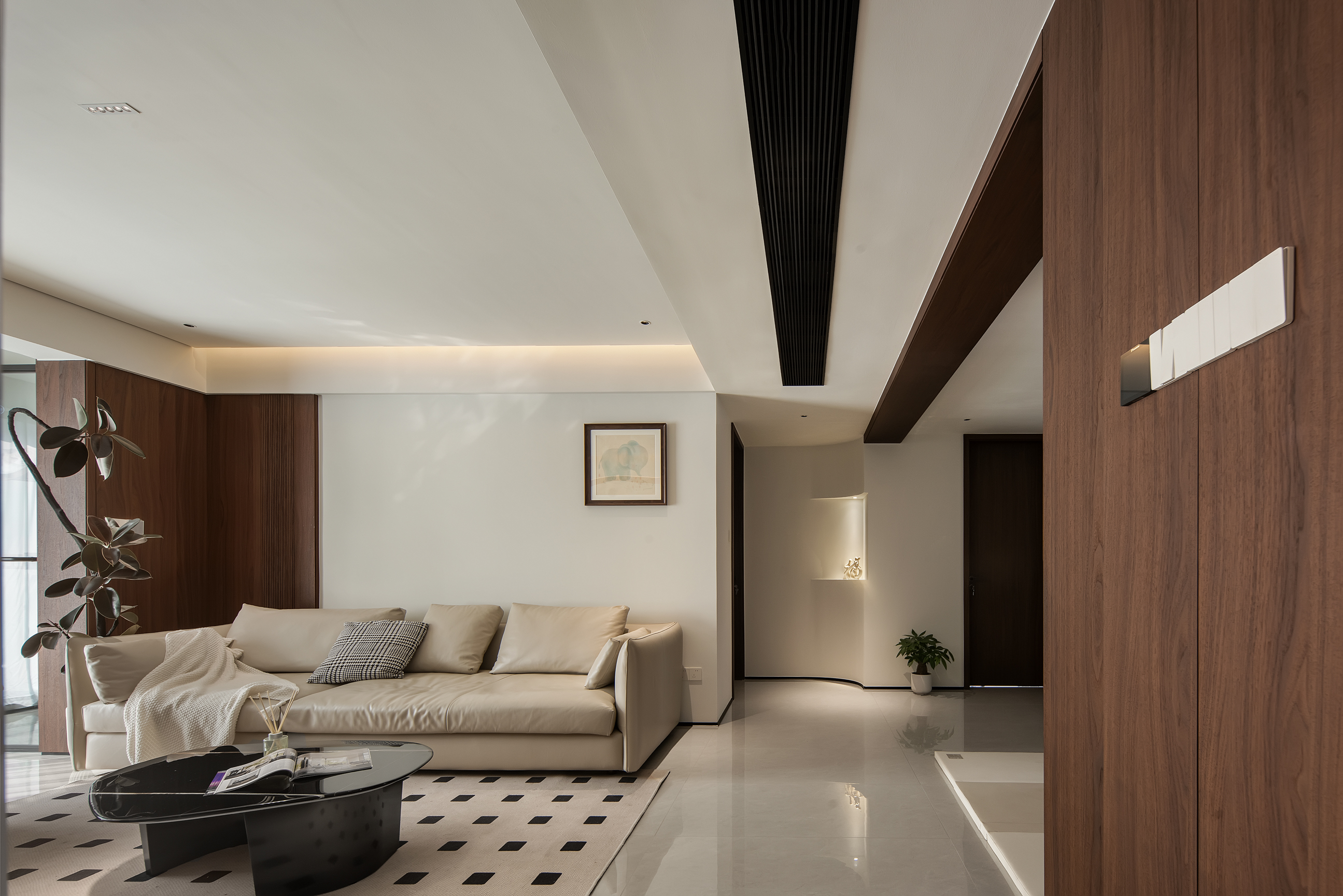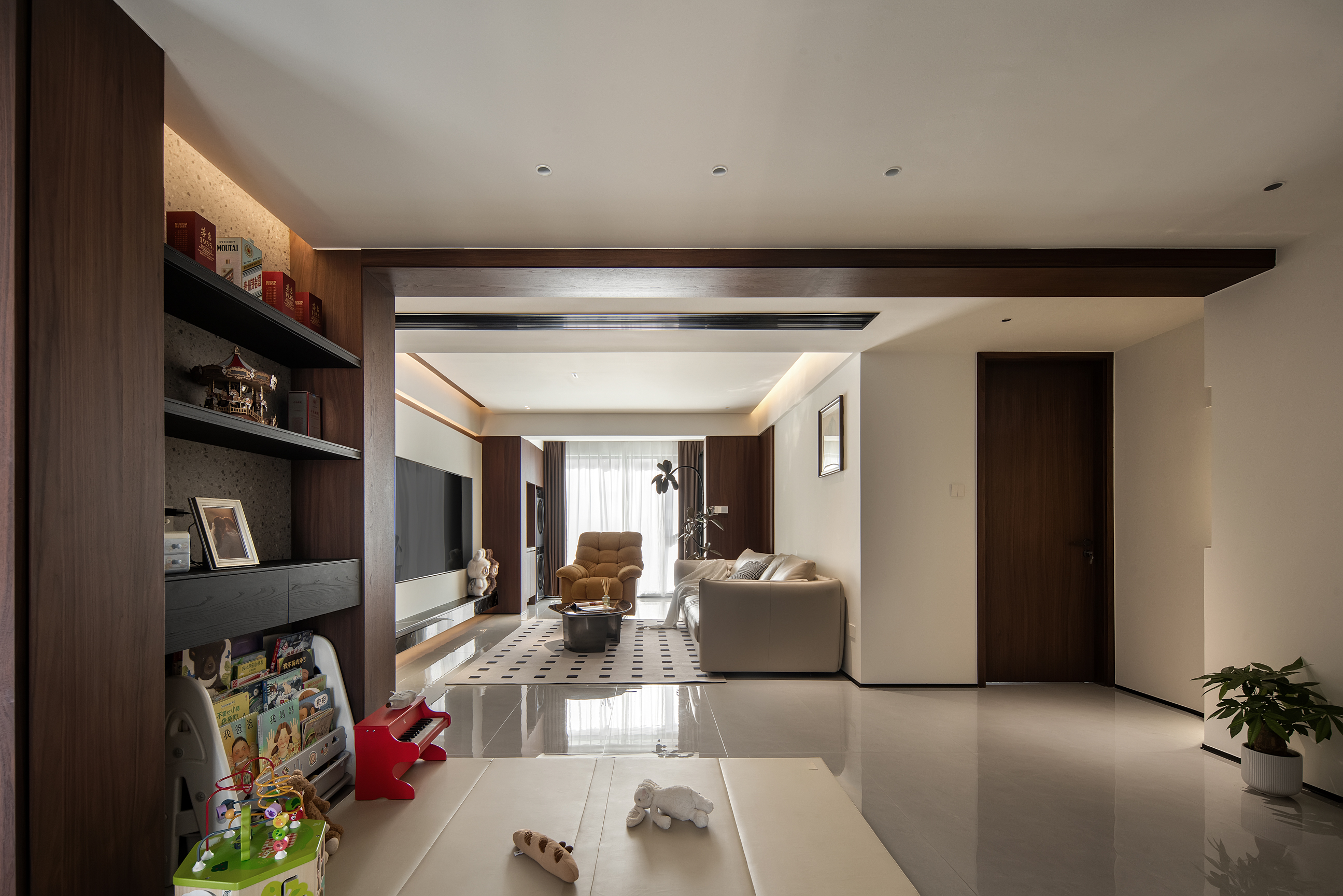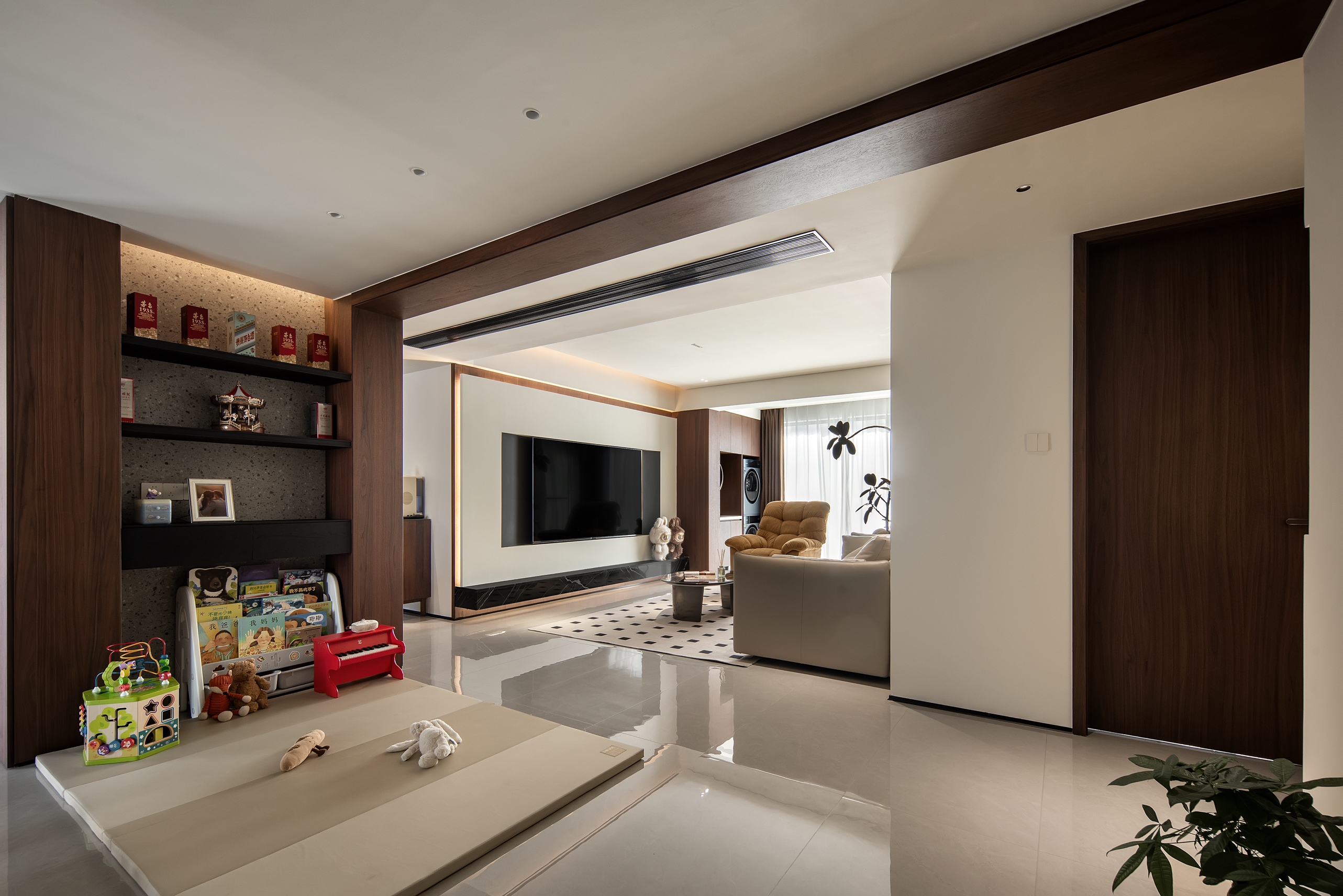 空间意境:本次意式极简设计在环境风格上打破传统极简的冰冷刻板与单一质感局限,以意式经典简约线条为基底,融合南昌本土居住的环境特征与生活需求创新营造空间氛围,弱化纯冷调几何布局的疏离感,融入温润的原木肌理与低饱和大地色系做环境质感调和,让简约线条与温润材质形成视觉平衡。