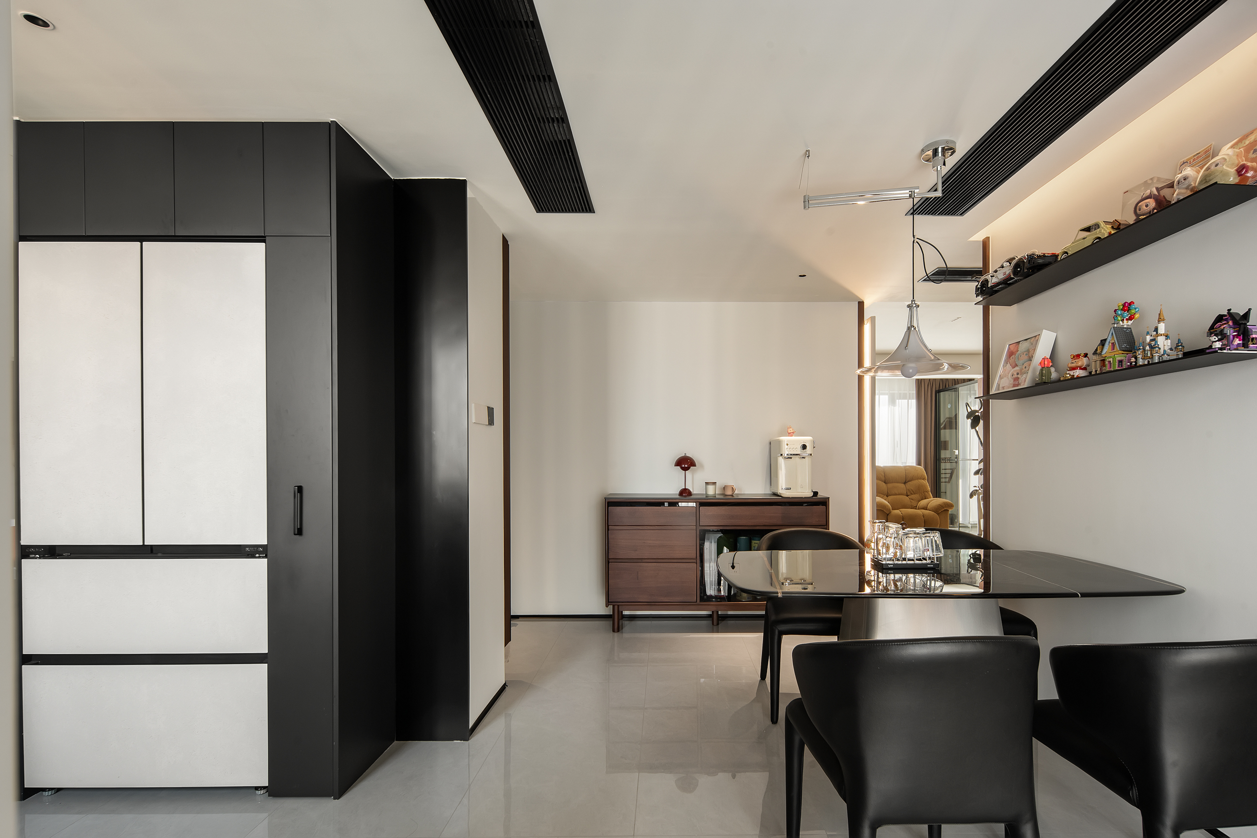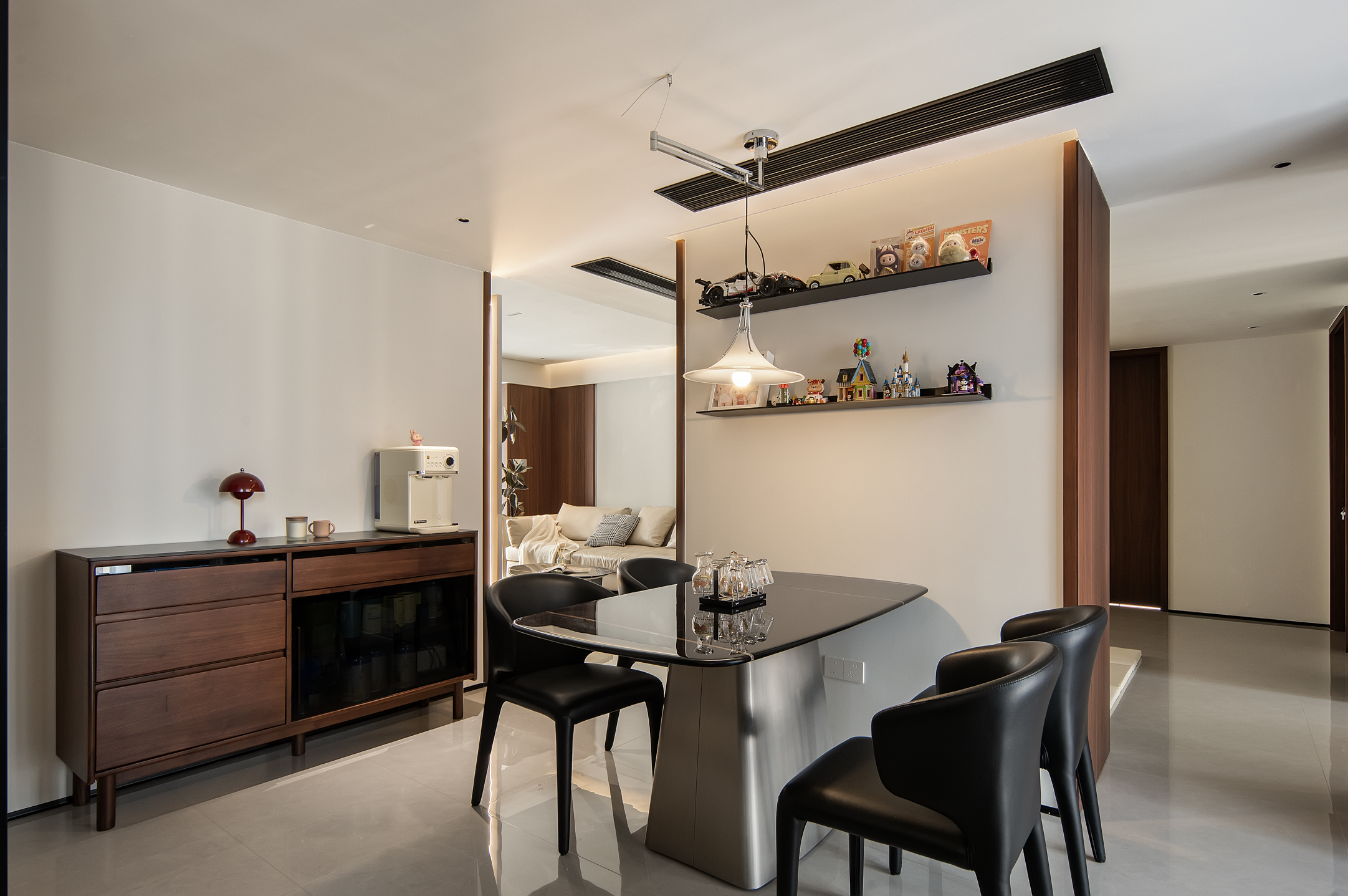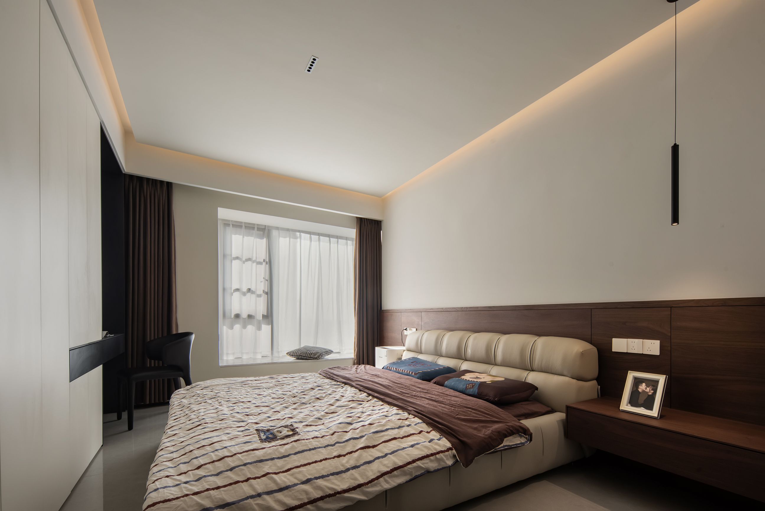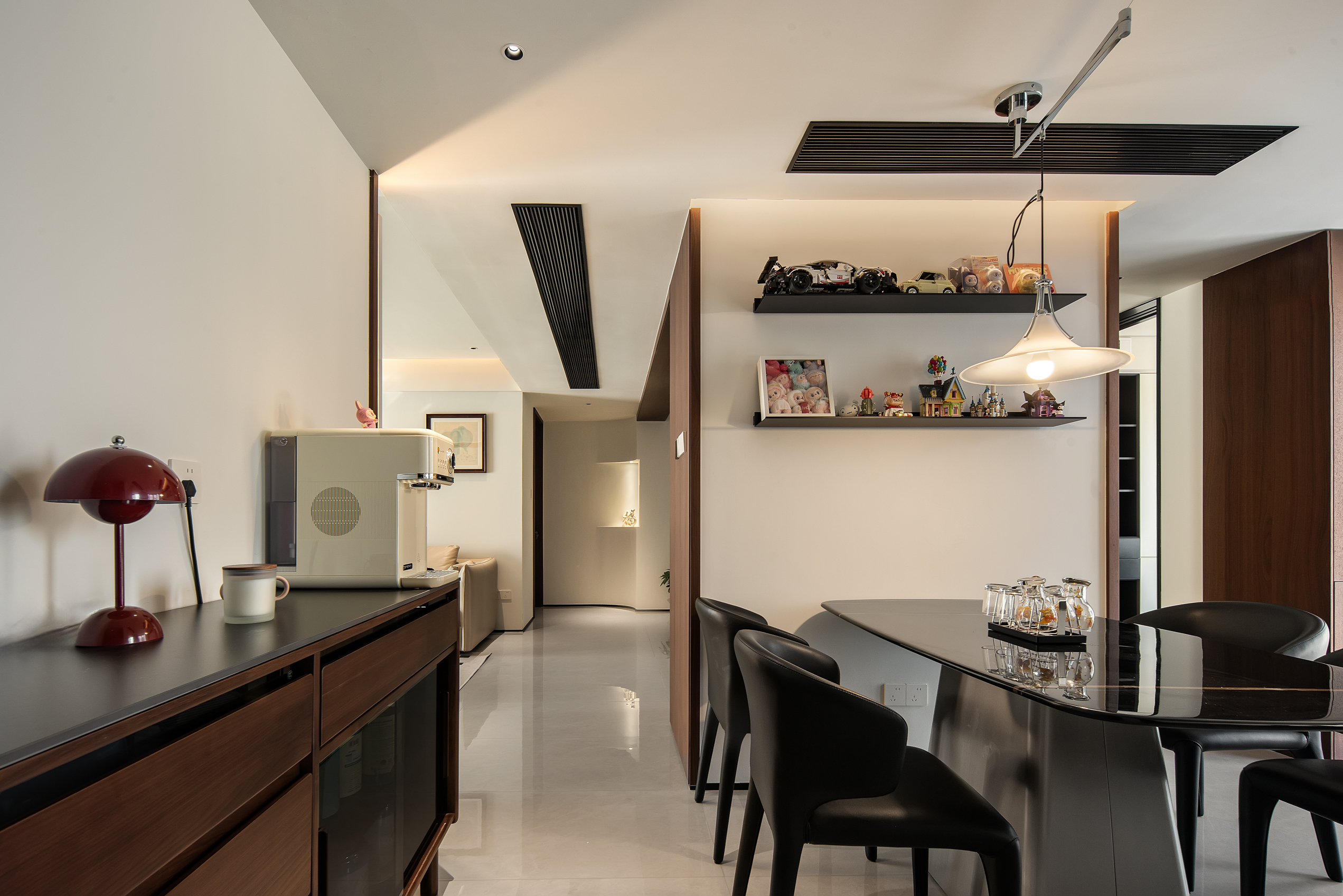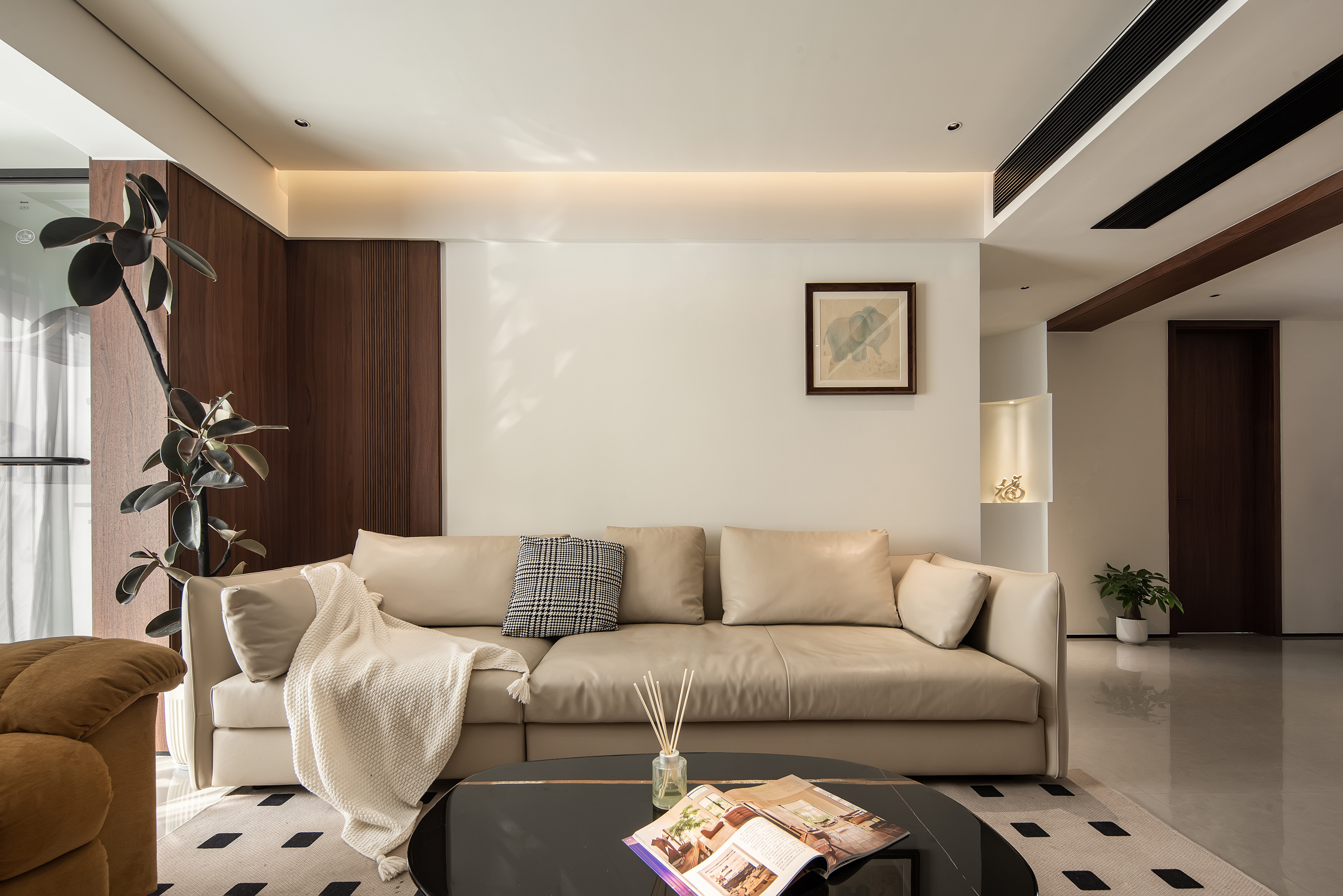 空间意境:本次意式极简设计在环境风格上打破传统极简的冰冷刻板与单一质感局限,以意式经典简约线条为基底,融合南昌本土居住的环境特征与生活需求创新营造空间氛围,弱化纯冷调几何布局的疏离感,融入温润的原木肌理与低饱和大地色系做环境质感调和,让简约线条与温润材质形成视觉平衡。
