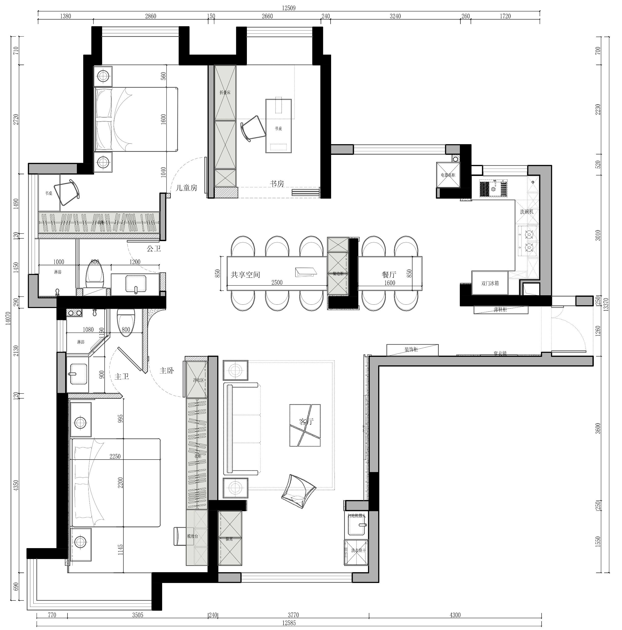 空间布局:平面上做了很大改动,原有户型四房,改三房,原有客卫在整个户型的中间位置,导致整个客户,南北不通透,刚需客户,只要两卧室,加一个书房多功能房,我们平面上去掉了原有客卫,打通南北方向,在原有客卫位置做成了公共活动区域,小孩子玩耍的空间更大了,在主卫旁边增加了一个客卫功能,北面房间做为儿童房,有个独立的衣帽区域,做饭的几率也不高,不用考虑油烟问题,厨房餐厅面积太小,就不考虑做厨房门了。