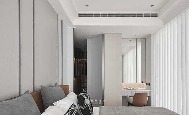 推开主卧房门,一道细密排列的垂直格栅隔屏划出柔和分界,其圆弧转折为私密领域营造一份恰到好处的含蓄感。绕过隔屏,进入以浅灰色调铺叙的寝居空间,床头背牆简约框线奠定素雅底蕴,配合对向大片落地窗透过白色窗帘,洒落柔和日光,让主卧在不同时刻呈现丰富流光变化;窗边梳妆台立面同样採用纵向沟缝,辉映入口元素,于一脉相承的线条中见设计之匠心,晨起时分,在自然光的轻抚下整理仪容,便是一日美好的开端。