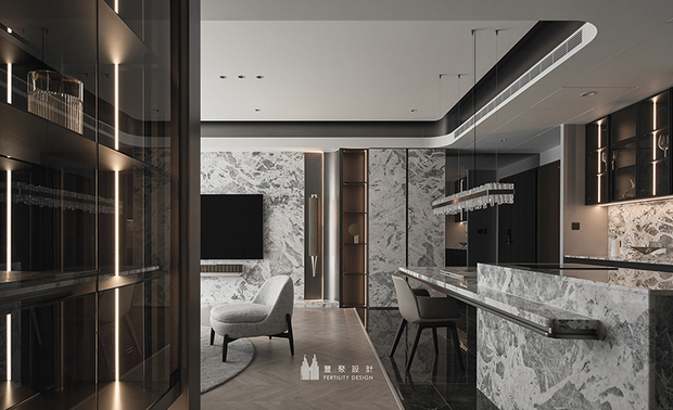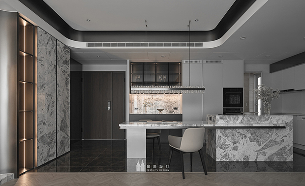 步入室内,开阔餐厨区映入眼帘,中岛吧檯以同款大理石延续玄关的设计语彙,厚实的檯面纹理流转有致,既保有场域的独立机能,又形成视觉上的流畅连贯、维繫空间整体的和谐韵律。中岛上方悬挂的水晶灯饰如冰凌般参差错落,晶透晖影洒落于檯面,为料理时光增添几分灵动姿态。一旁,浅灰色调的柜体与天花维持着整体色系的一致性,简洁俐落的线条勾勒纯粹美学风格,而内嵌于牆面的展示柜与背光设计,使收纳与展示在此自然交融,日常餐食准备也因此成为一场赏心悦目的生活仪式。