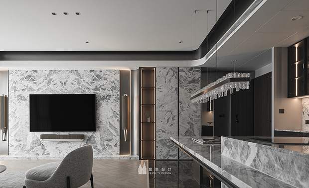 丰聚设计的两位总监──李羽芝与黄翊峰,深谙「家」的本质在于回应居住者的生活期许,整体以浅灰色天然石材的温润质地为基底,佐以深邃色调的沉稳内敛、金属线条的细腻层次,以及自柜体缝隙倾泻而出的和暖莹光,在开阔格局中层层编织当代家宅的精緻品味,明暗之间流淌恢弘气度,自然串起每一个生活片段。