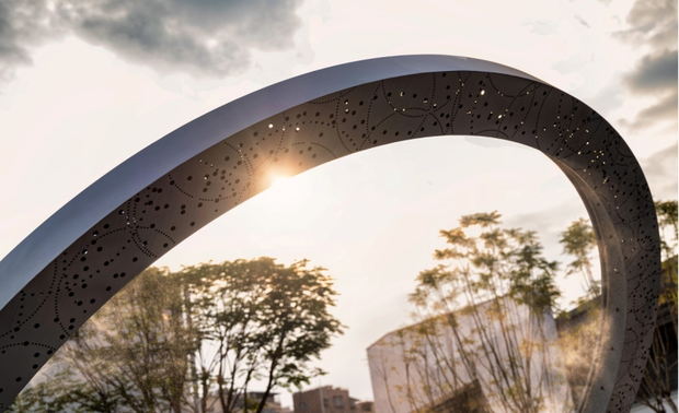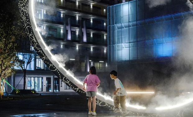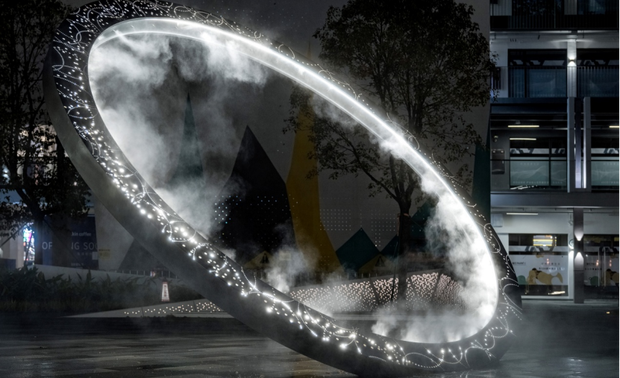 景观雕塑星环如同时光之门,布置于场地中心,夜晚灯光渐起,星环点亮,水雾在灯光下起舞,我们可以捕捉光的活动,仿佛穿过星环,会是另外一个空间。