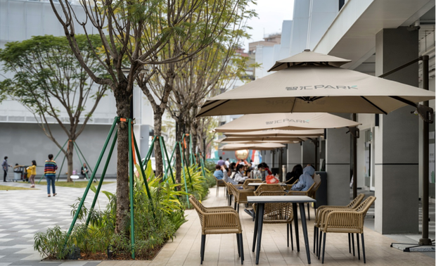 ▲商铺前的休闲平台为办公人群提供交流空间