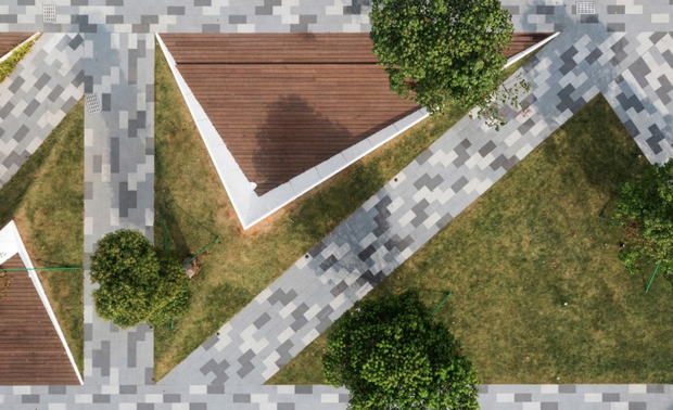 由于场地建筑围合形成三角地块,景观顺应建筑布局,三角元素融入景观构图中。场地中心为艺术景观雕塑--星环,由此装置向周边延伸,分别为商铺休闲平台、露营草坪、三角休闲看台。