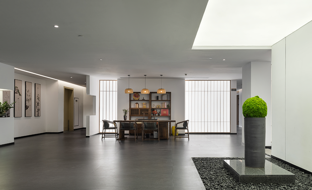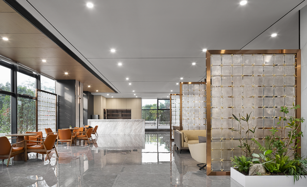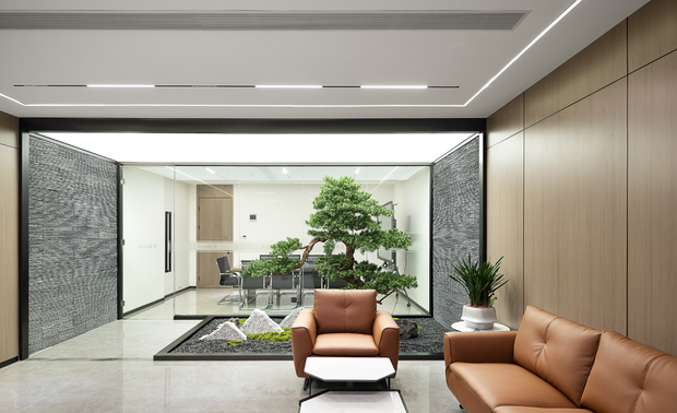 踏入办公室接待区,“舒适”与“大气”两个词就出现在我的脑海里。以简洁、现代的设计为基调,利用方块沙发和精致茶几营造出高品质、专业的氛围。园林微景观的装点,空间与植物共生一体,钢筋水泥因此有了温度。