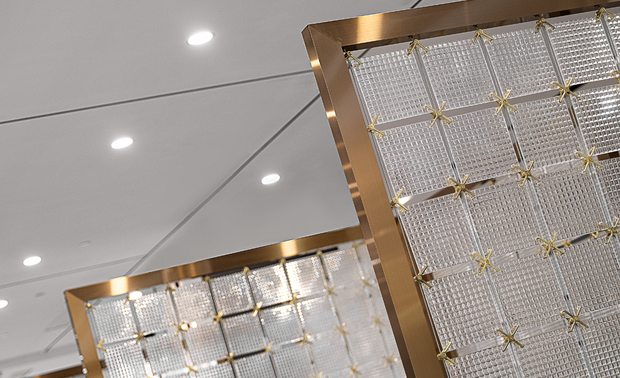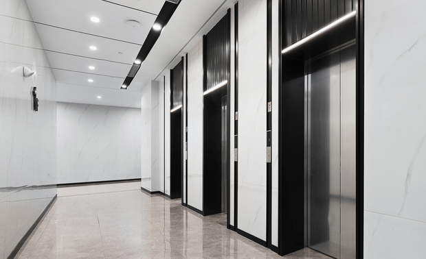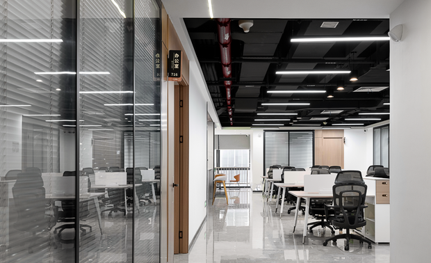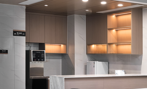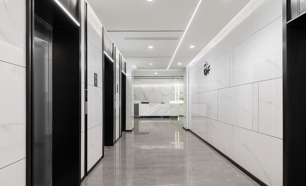 电梯走廊和写字楼整体色调统一,在不失商务高级感的前提下加以LED的呼吸灯以最节能的方式展现未来感。