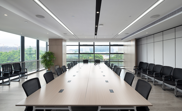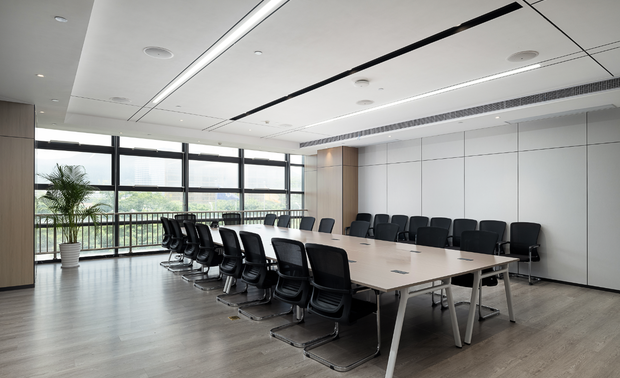 全景落地窗户的会议室,办公环境无敌了。黑色舒适座椅配备桃木长桌,带来一种杂糅合理性和感性的形式之美,为员工打造一个“放纵+灵动”的友好会议环境。