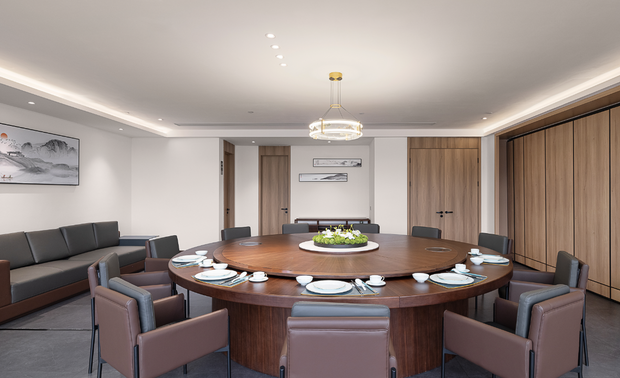 办公楼还设置了宴会包厢,满足企业的重要接待及庆祝活动。整体设计简约高级,摒弃过于繁琐的装饰,以不同材质的交叠体现空间的层次及艺术感。