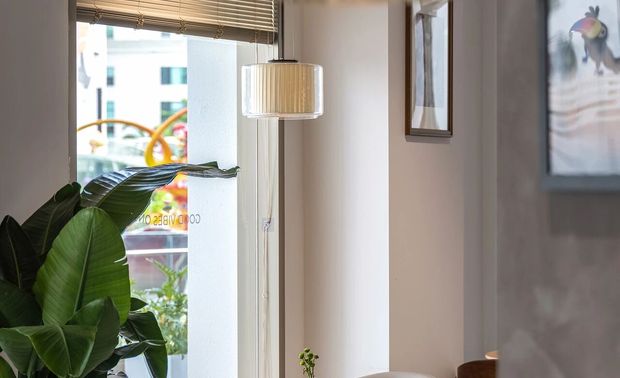 空间内,绿意无处不在墙面上的植物壁画与真实的绿植相映成趣宛如身处自然之中木质家具与棉麻材质的布艺相得益彰带来一种温暖而质朴的感觉每一处细节都透露出对自然的尊重与热爱仿佛可以听见万物生长的呼吸声。