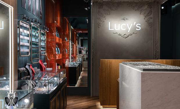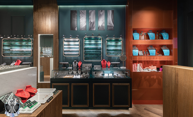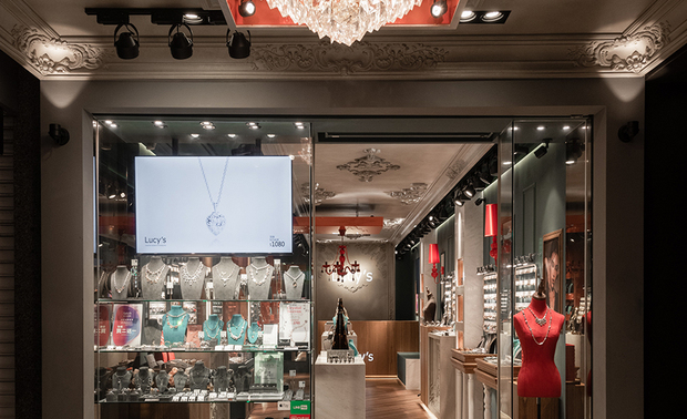 ▲骑楼天花板设计古典凋花与水晶吊灯,将优雅氛围延伸至商圈街道,成为日夜闪耀的视觉焦点,引导顾客从日常步入精緻情境;橱窗以大面透明玻璃呈现多种饰品的佩戴效果,加上色彩对比与品牌logo,让路人感受「精品却亲民」的第一印象,激发进入店内的好奇心与停留意愿。