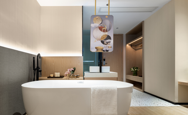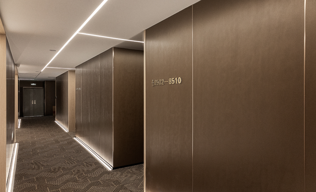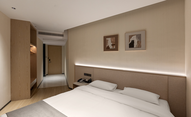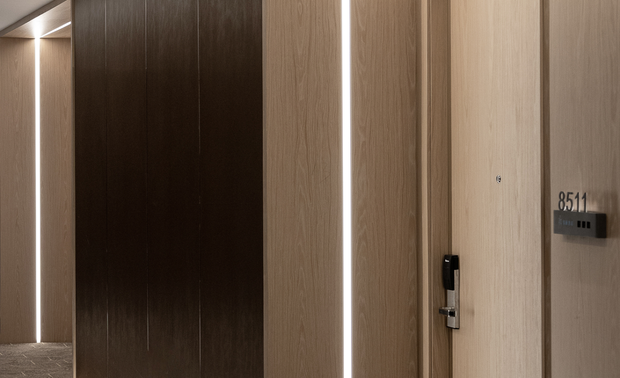 客房的走廊是所有住客的必经之路,是酒店空间中重要的组成部分。在翡丽酒店设计中,GDD深思设计将走廊以灯光为纽带,传递对时尚的追求。柔和的照明设计搭配原木色饰面板不仅能够满足功能性需求,还能营造出优雅、宁静的氛围,使住客在穿梭于客房之间时,感受到时尚的气息。同时,走廊的照明设计也能够突显空间层次感,增强视觉效果,让酒店的设计更具吸引力。