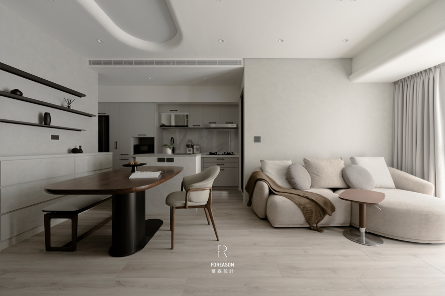 擎森设计 设计总监 陈楚扉 洞悉较小坪数的设计关键,选用纯白和浅灰作为主调,藉由浅色调的光线反射特性放大视觉尺度,精心挑选的傢俱软件则恰如其分地定义场域。弧形沙发如云朵般鬆软,以柔和弧度化解小空间的侷促感,轻柔邀请屋主卸下一日疲惫;窗边洒落的自然光线,随时序变换而在其中描绘动人光影。每处细节的推敲琢磨,都在体现居者对美好生活的想像,让家不再只是归处,更是一场与美学对话的日常仪式。