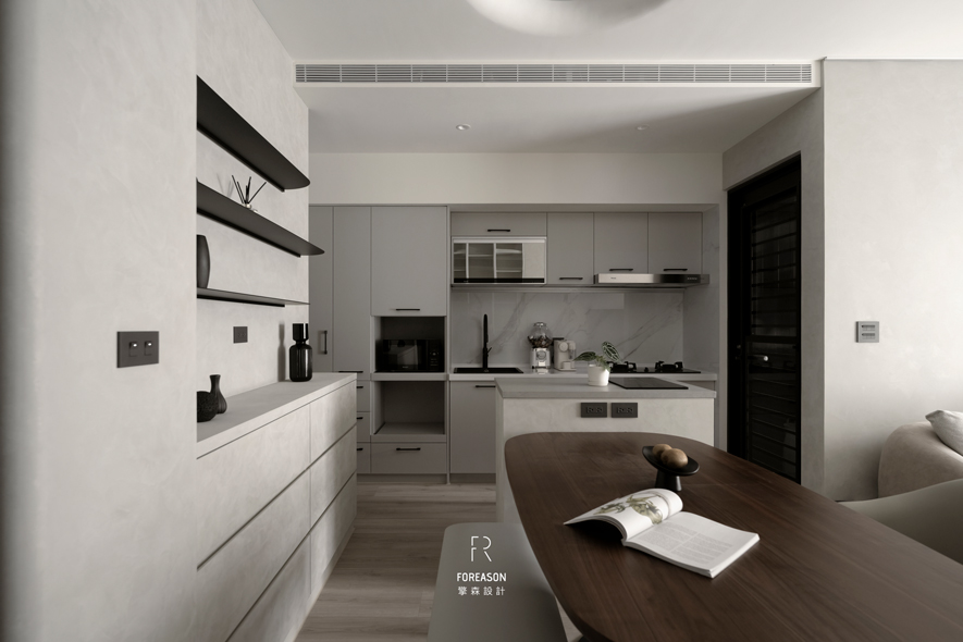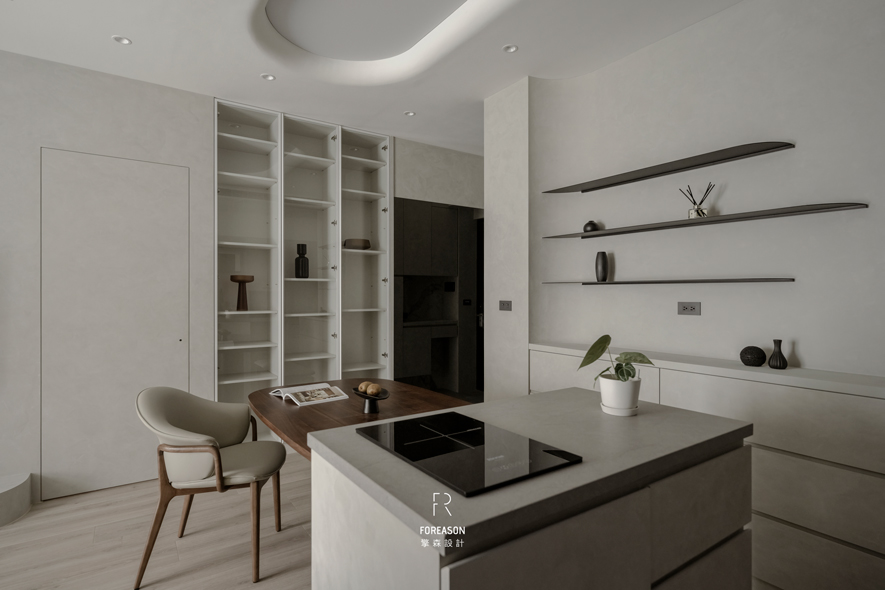 天花以圆弧内凹搭配隐藏灯带,光线细腻漫溢至整个空间,像是为生活披上一层静谧的滤镜。背牆下方白色柜体採无把手设计,平整立面如同留白画布,上方设置黑色金属层板水平延展,让器物的陈列也成为空间设计的一部分。厨房配置灰色烤漆橱柜和白色檯面,构成简练清爽的视觉效果,中岛深灰石材倒映着光晕,成为料理时的舞台中心及家人围聚閒聊的据点。线条与转折在此重新定义餐厨空间的意义,承载日常裡所有值得被珍视的相聚时光。