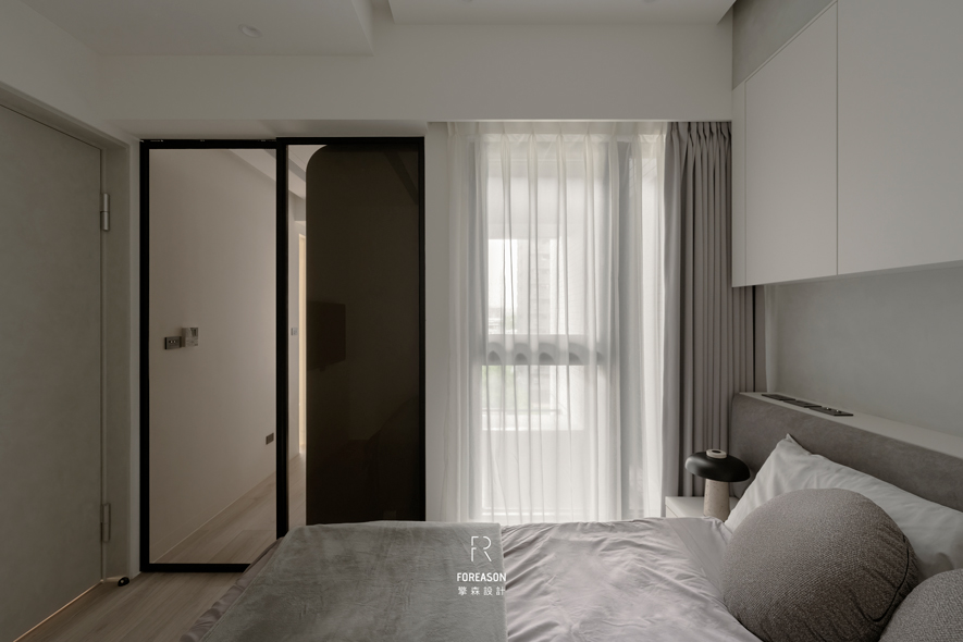 卧室延续全室的简洁色调,定调浅灰与米白交织出轻柔氛围。床头採用深灰色软包设计,细緻触感托住疲惫身躯,上方的白色吊柜提供充裕收纳,维持立面的纯淨俐落,牆面凹槽设计则保留下方插座使用空间,配合两侧床头柜容纳睡前阅读的书籍、一杯温水,满足居者休憩时的日常所需。窗边双层窗帘展现贴心巧思,白色纱帘过滤晨光成柔和漫射,深灰遮光帘则守护夜晚安眠时光,可随心调节光线明暗及隐私需求,成就让身心沉淀、安然入梦的私密场域。