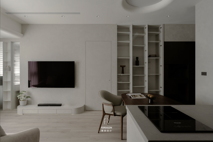 客厅选配纯白为基调,浅色木纹铺陈温润肌理。正前方电视牆採极简手法,悬挂式电视搭配白色矮柜延伸俐落轮廓,置于柜上的绿植点缀生机,让热爱植栽的屋主能在日常浇灌中,看见绿意随四季流转的灵动生命力。两侧高耸的白色展示柜成为空间端景,长虹玻璃门片如水波般折射光线,开放式层架陈列旅行带回的纪念品及珍藏的艺术品,记录回忆中所有的点滴美好。整体在素淨中蕴含细緻感受,构筑令人心神沉静、能真正放鬆生活的场景。