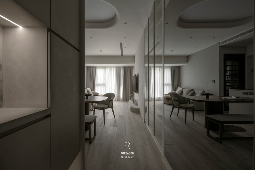从玄关镜面延伸的虚实光影、客厅长虹玻璃营造的通透层次,到卧室双层窗帘带来的光线调节,每处设计都体现设计师对细节的入微观察。空间在低调中展现质感,于留白处彰显品味,擎森设计 设计总监 陈楚扉 秉持「由空间表达独特魅力」的设计理念,将当代美学与日常机能无缝融合,打造一处令人心之所嚮的理想场域,为都市生活刻划居所的崭新面貌。
