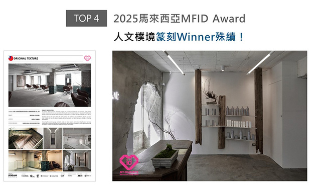 纬纶设计团队呼应商空「释放独特自我」的品牌理念,採用减法设计精简空间装潢,并敲凿原始建筑的部分结构,形塑纪录时光流逝般的质朴肌理,瀰漫颓废艺术独到美感的髮廊《Original Texture》,抱回2025 MFID商业空间类「Winner」大奖!