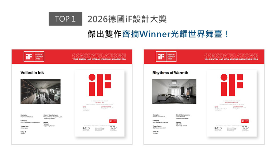 世界四大设计奖之一的德国 iF 设计大奖,在国际间拥有无可取代的指标性及前瞻性。本届赛事,纬纶团队精心挑选两件作品报名参赛,《墨隐》跳脱办公场所的制式,藉由整室沉静暗调佐搭木纹、金属异材,打造细腻精美的工作环境;另一件《暖序》运用匠心奠下的留白,辅以地坪及软装的浅灰层次,营造简约舒心的居家氛围。两间精美创作一同赢得此次「Winner」大奖!