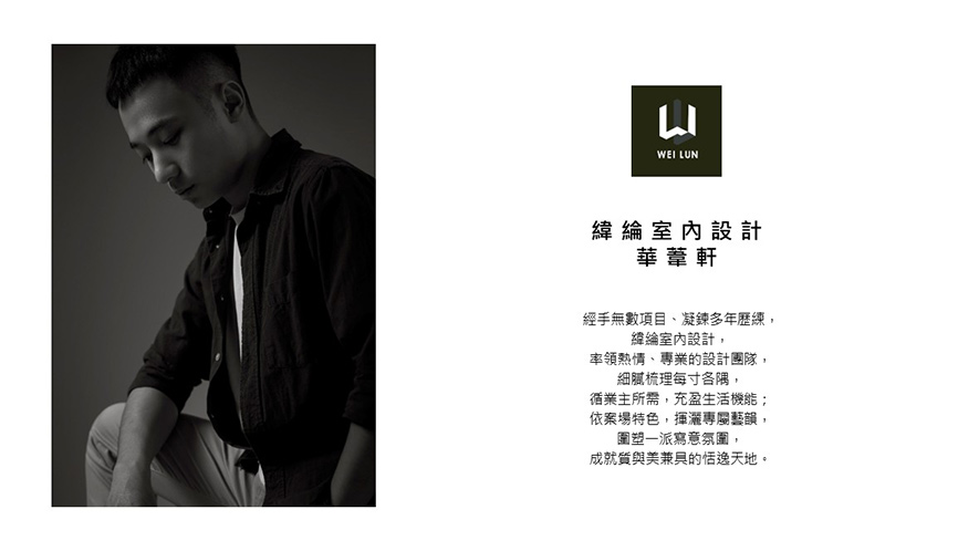 「好的设计不在复杂,在于好看、好用、好感受。」纬纶设计 设计总监 华苇轩 的核心理念看似简洁俐落,实行之时,团队中的每位设计师仍会抱持最严谨、认真的态度,面对所有客户需求及案场细项,并掌握创意梦想和现实条件之间的平衡,实现一件件契合所需的精緻作品,将纬纶设计关怀业主感受的诚挚美学,一点一滴透过空间,递予社会中更多人们温馨暖意!
