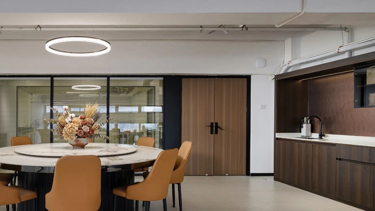 自然光被最大限度引入室内,与干净的墙面、温润的木作、利落的柜体相互呼应,让理性的科技空间多了一份柔和与温度。