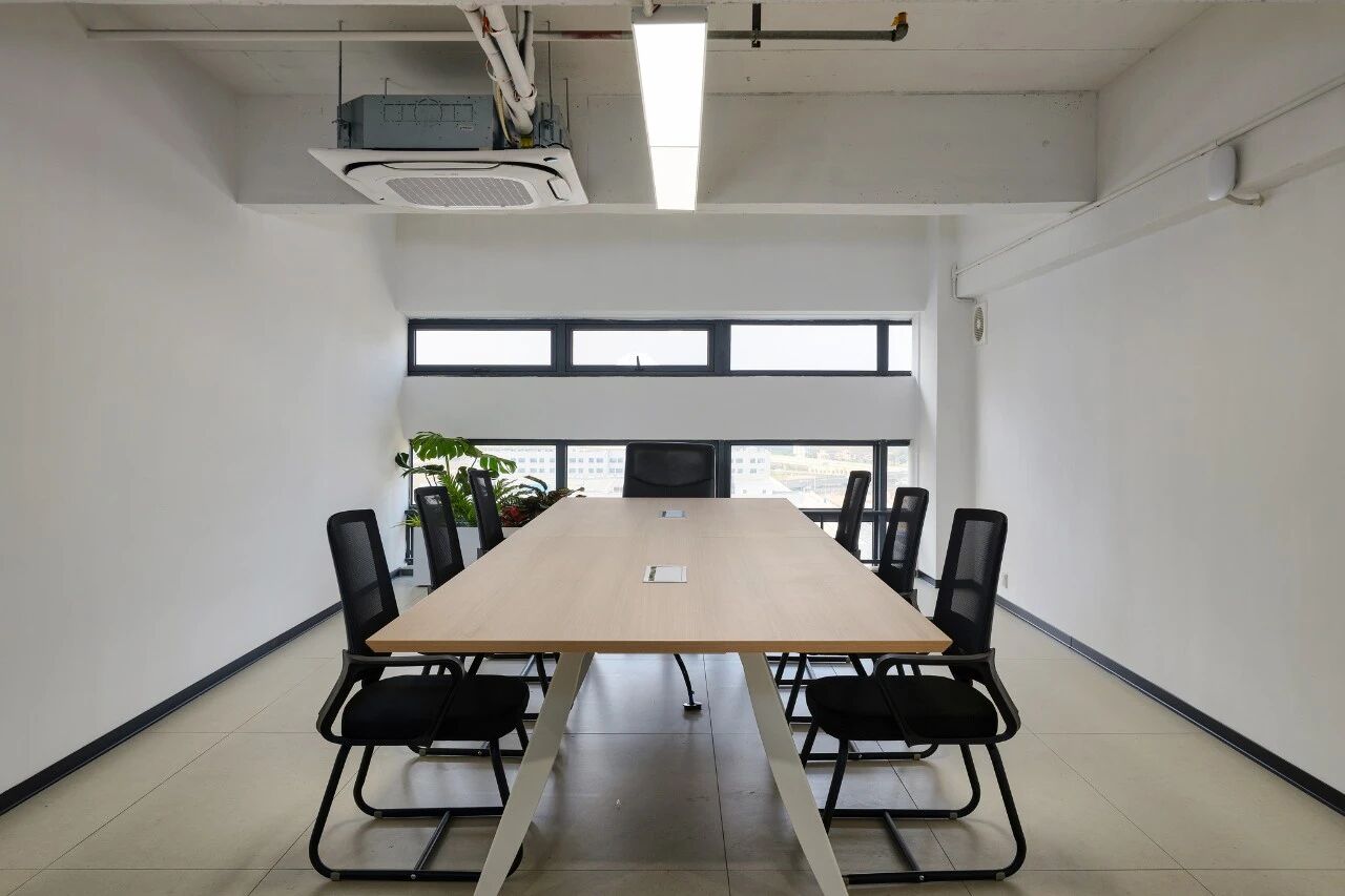 会议室以简洁的线条与克制的色彩,打造出专注、高效的会议氛围。浅木色的会议桌搭配黑色网布椅,既现代又实用;大面积的玻璃窗引入自然光,让思想的碰撞在明亮、开阔的环境中自然发生。