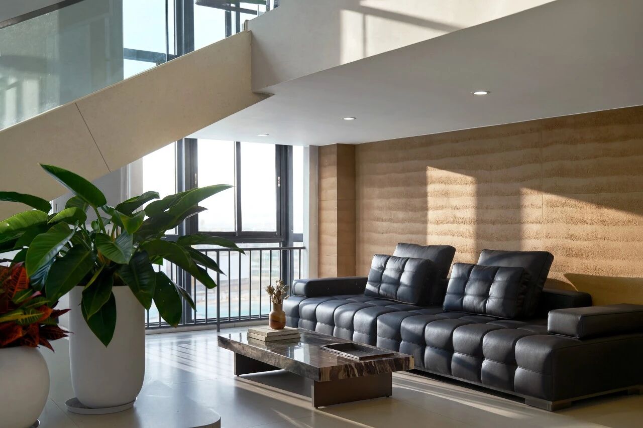 步入声王科技的一楼大堂,温润的夯土墙面与利落的现代线条形成鲜明对话。阳光透过大面积落地窗,在空间中游走,为硬朗的黑色皮革沙发与大理石茶几镀上一层柔和的光晕。