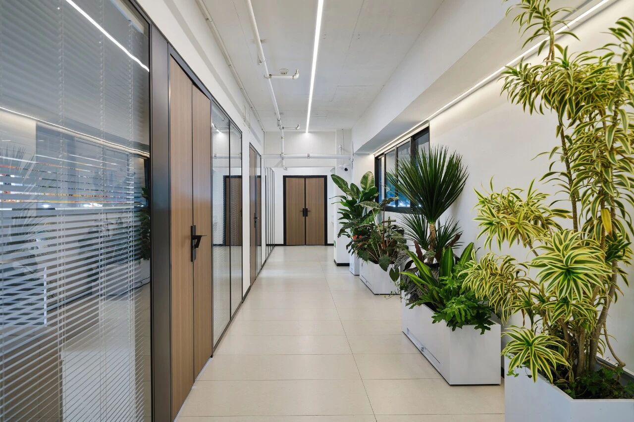 员工办公区以通透的玻璃隔断划分功能,既保证了空间的开阔感,又实现了高效协作。我们将自然引入室内,沿走廊与工位旁布置的绿植,为忙碌的工作注入生机与活力。