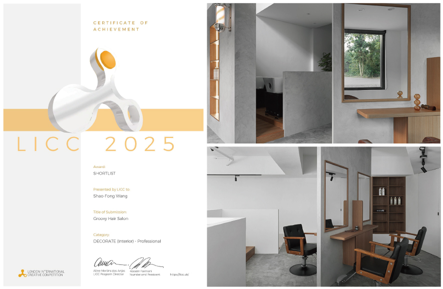 全球指标性设计大奖London International Creative Competition(英国伦敦国际创意大赛,简称LICC),于2006年开展至今,每年皆向多国设计好手发出邀请,藉由评选出当中佼佼之作,引领建筑、绘画、影像等11大创作领域齐步向前!日工设计 设计总监 王绍峰 以两件风格鲜明的商空作品角逐本届赛事,其中《Groovy Hair Salon》将灰阶艺术涂料和温润木质揉合于挑高双层结构,墨绿磁砖柜台藉由色彩为动线指引,简约却富韵致的沙龙场域兼顾开放明亮及私密舒适,获选「Shortlist」殊荣;另外《Twilight 餐酒馆》则取暮光意象为灵魂,採用奶茶色雾面涂料与手工凿刻壁面,配合低色温暖光层次铺陈,将减法设计推向极致,构筑出日夜交界般令人微醺放鬆的沉浸式用餐场景,荣获「Finalist」亮眼肯定!