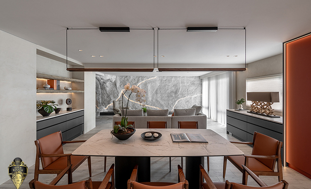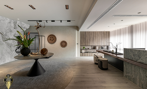 10美国MUSE Design Awards致力于发掘全球设计缪思,涵盖建筑、室内、时尚等领域。2026年共吸引来自124国、超过十万件作品参赛,由200多位专业评审严格遴选,为国际设计界的重要指标。虎宙设计 设计总监 梁诗敏 深入探究屋主二人的喜好特质,藉由双客厅的格局设计,规划一处飘蕴朴实禅意、一处鲜明吸睛的迥异公领域,分别回应男女主人对沉心自然、创新艺术的品味追求,同时于机能层面满足各自的商业会谈与社交茶叙需求;复合型住宅《岩境‧橙曦》不仅贴合居者们的生活习惯,亦对应本赛事讲究的「创意巧思及创作深度」核心,顺利斩获「金奖」出色佳绩!