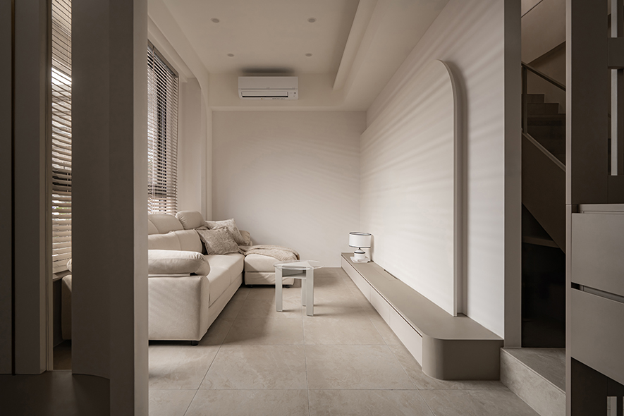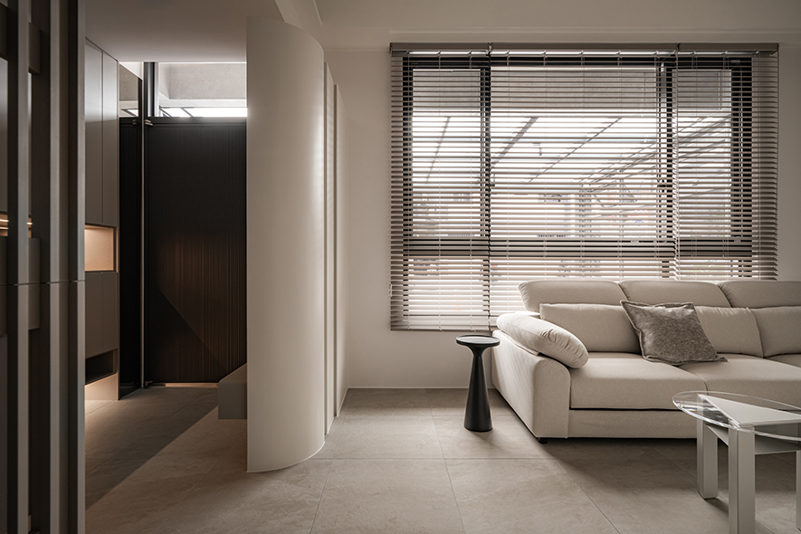 踏入这方天地,浅灰、暖白交织成一袭静谧底色,百叶筛落的日光在石面与织布间缓缓游移,像是时间甘愿于此放慢脚步。弧形牆面顺势收束原始樑柱的视觉断点,一旁格栅隔屏以克制姿态界定场域;楼上玻璃砖牆更为室内引入充沛光线流动,以半透光特性重新分配採光层次,一座为日常而生的居所,褪去张扬,捨掉矫饰,凭光影留白,织就归人无须言说的安定。
